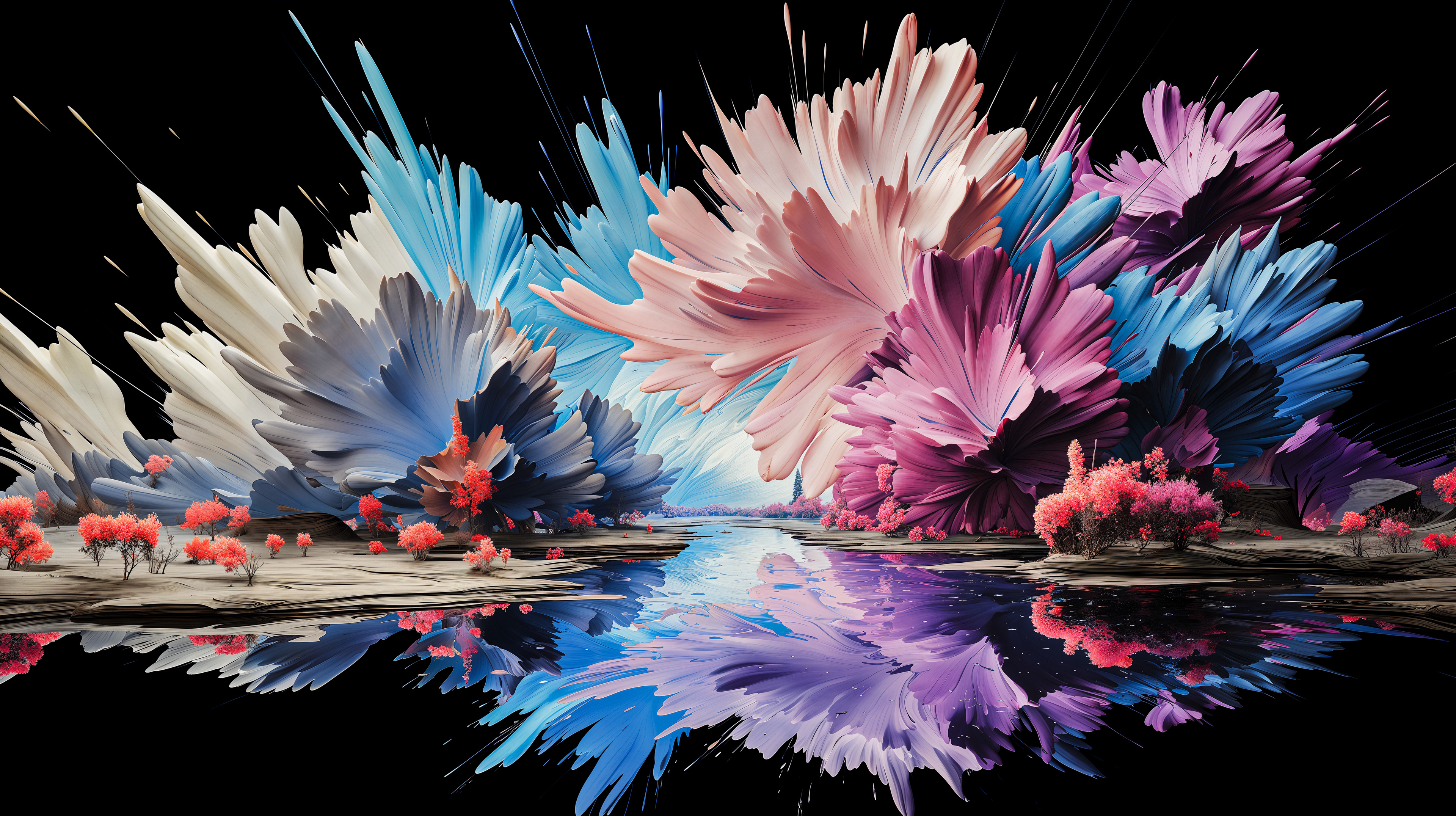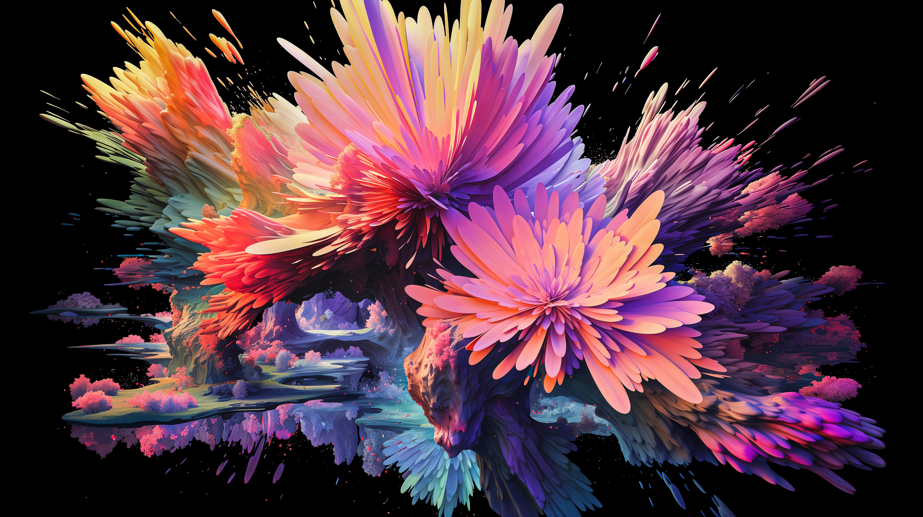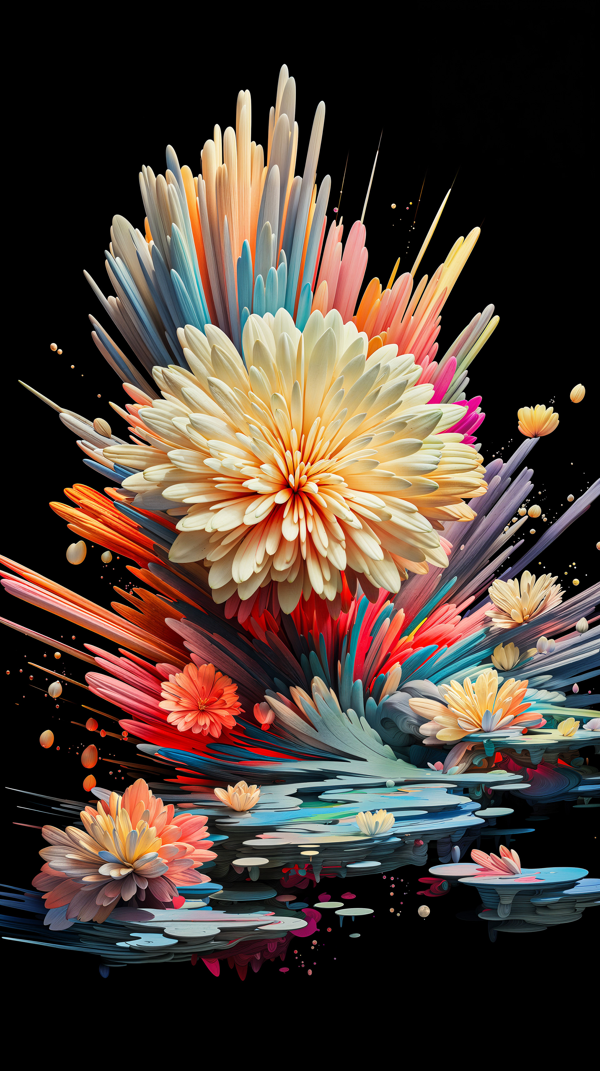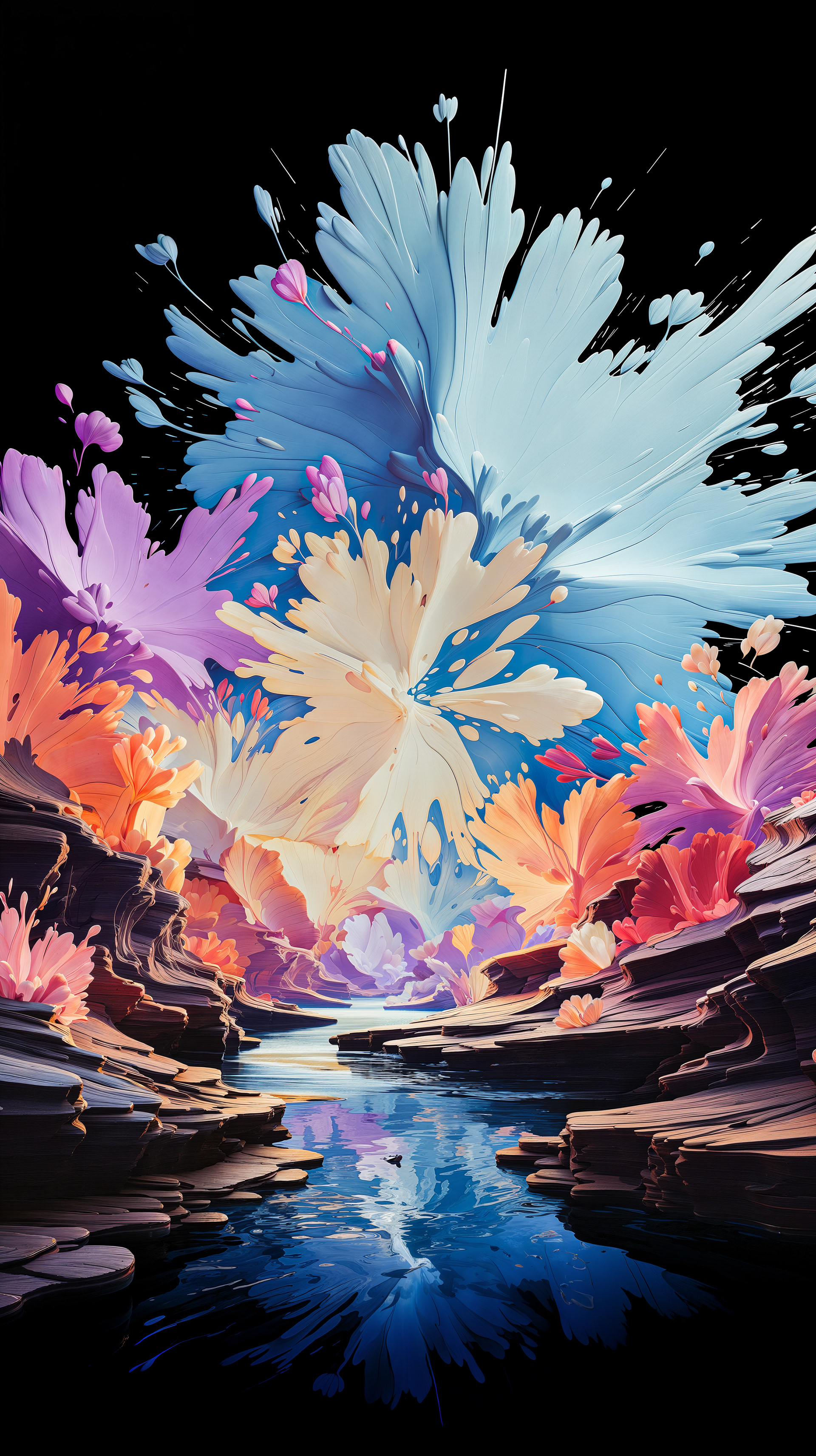 This abstract series captures organic forms in a moment of radiant bloom. Petals and crystal-like structures unfold in vivid layers of color, reflecting across fluid surfaces and dissolving into luminous motion. The works evoke growth and transformation, turning natural gestures into dreamlike compositions shaped by light and flow.