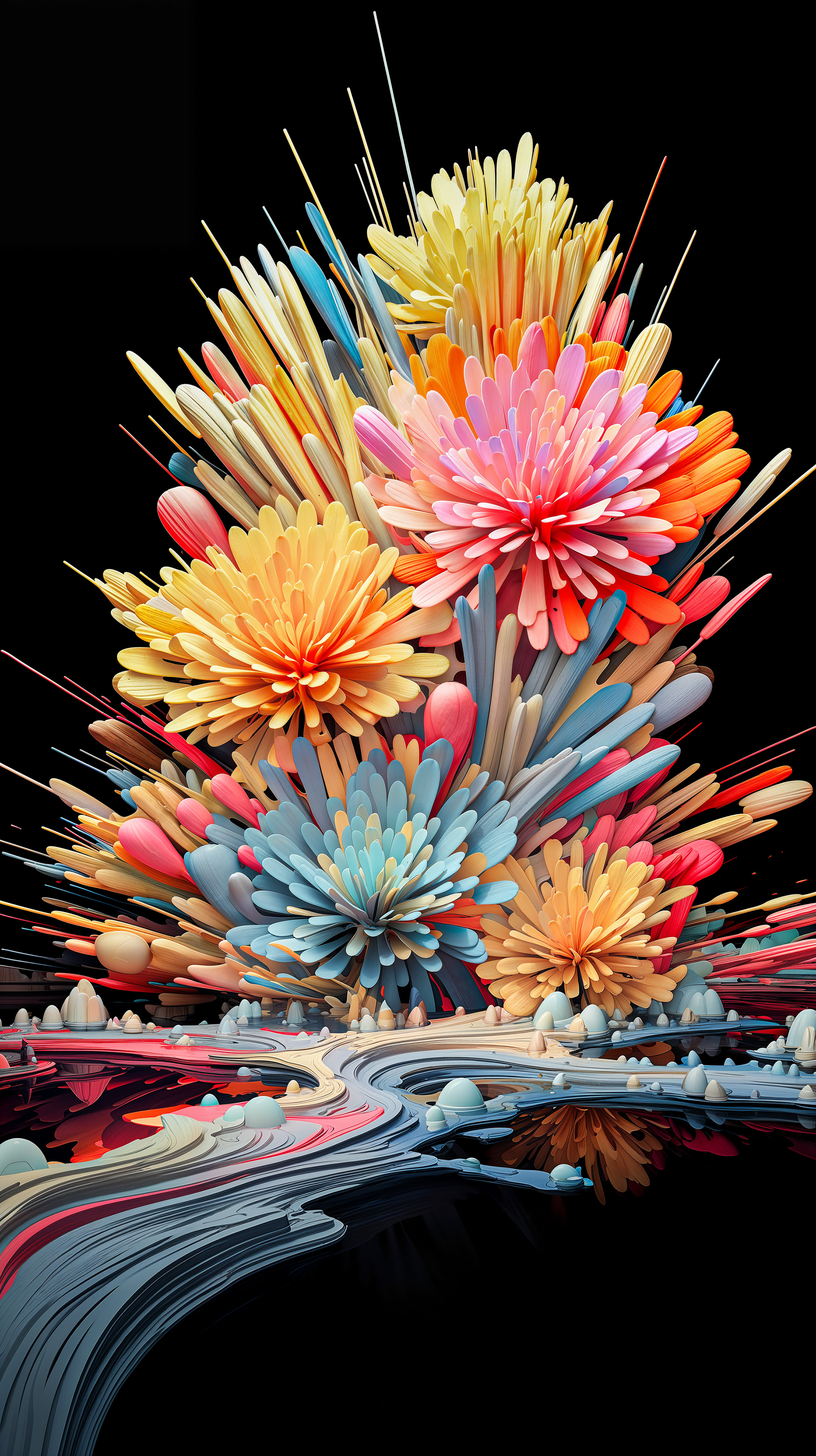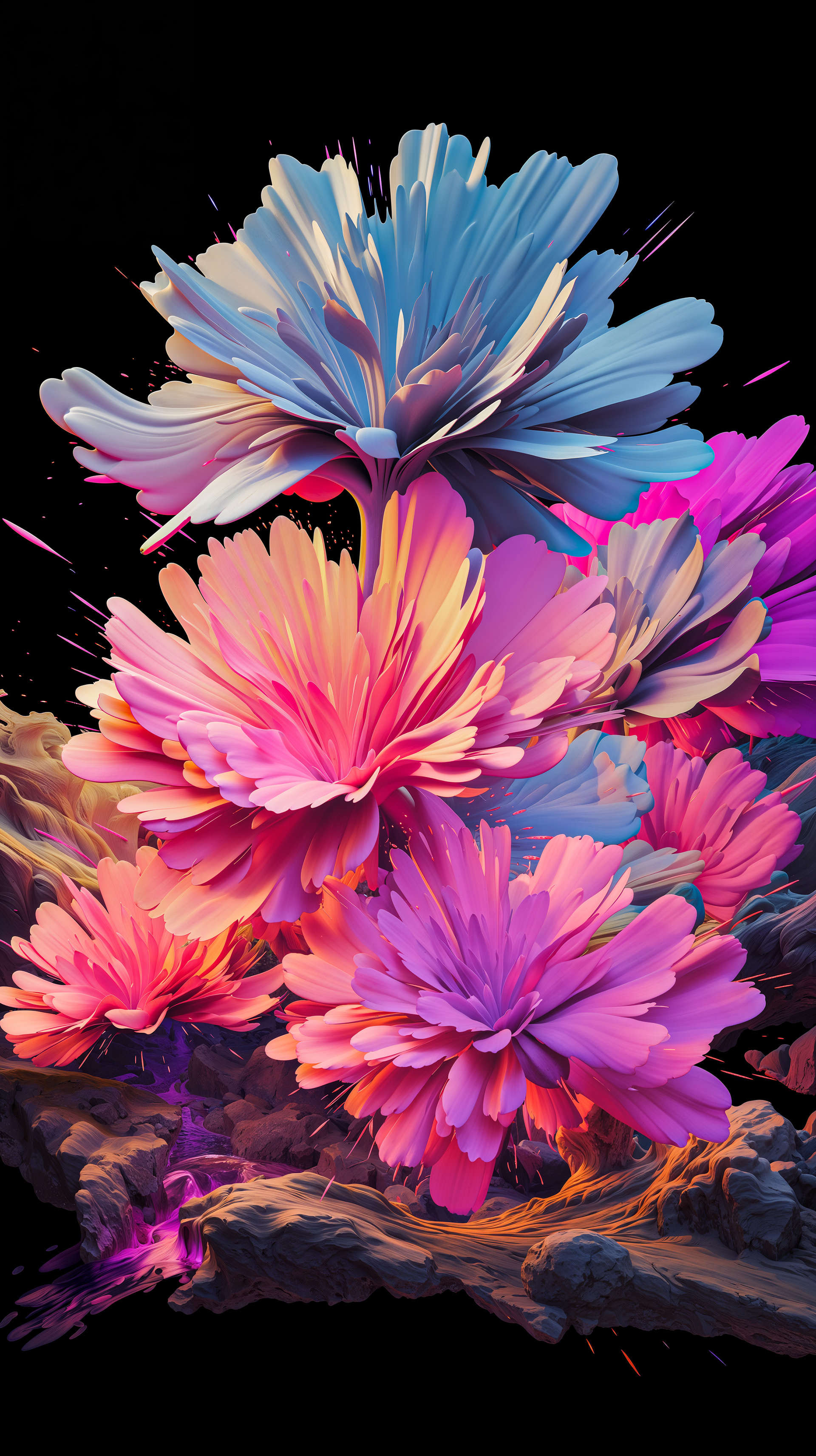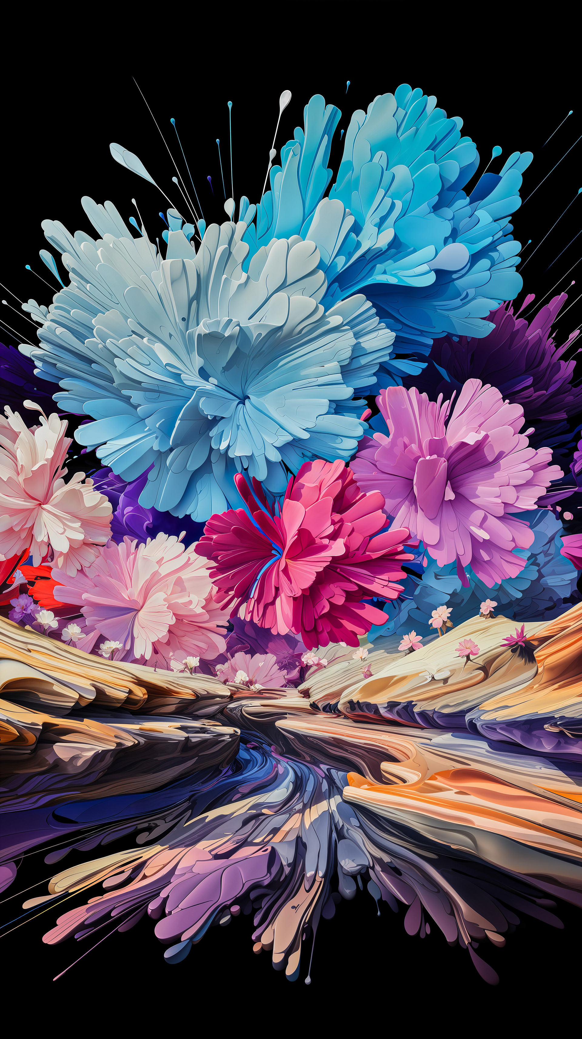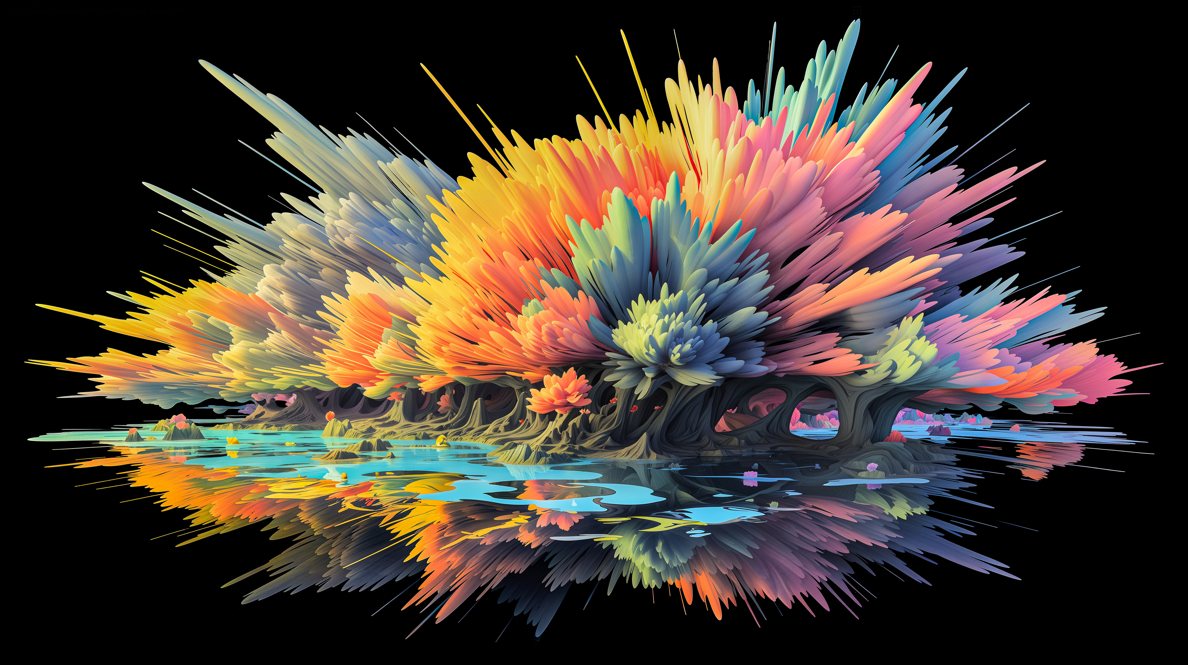 This abstract series captures organic forms in a moment of radiant bloom. Petals and crystal-like structures unfold in vivid layers of color, reflecting across fluid surfaces and dissolving into luminous motion. The works evoke growth and transformation, turning natural gestures into dreamlike compositions shaped by light and flow.