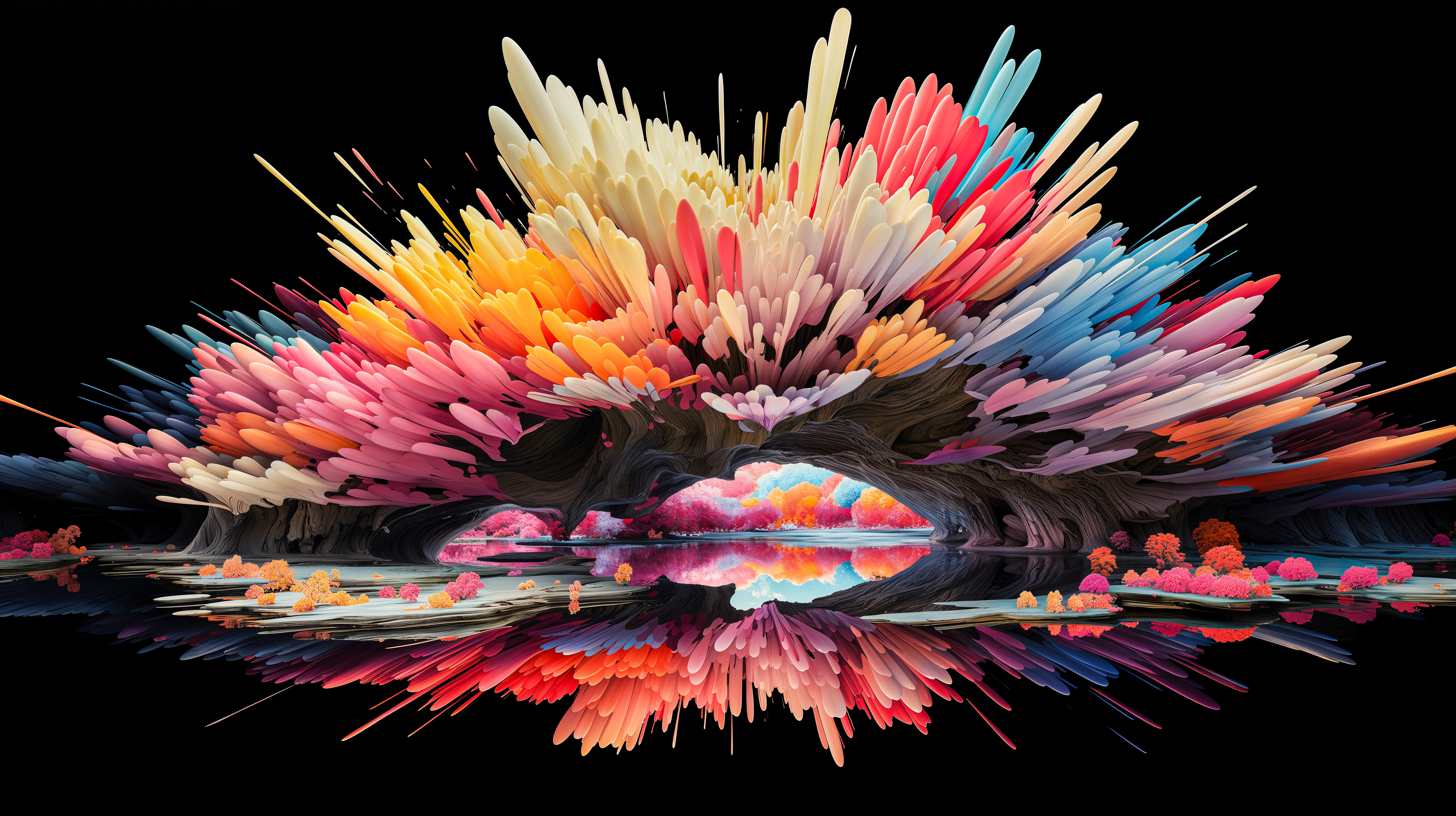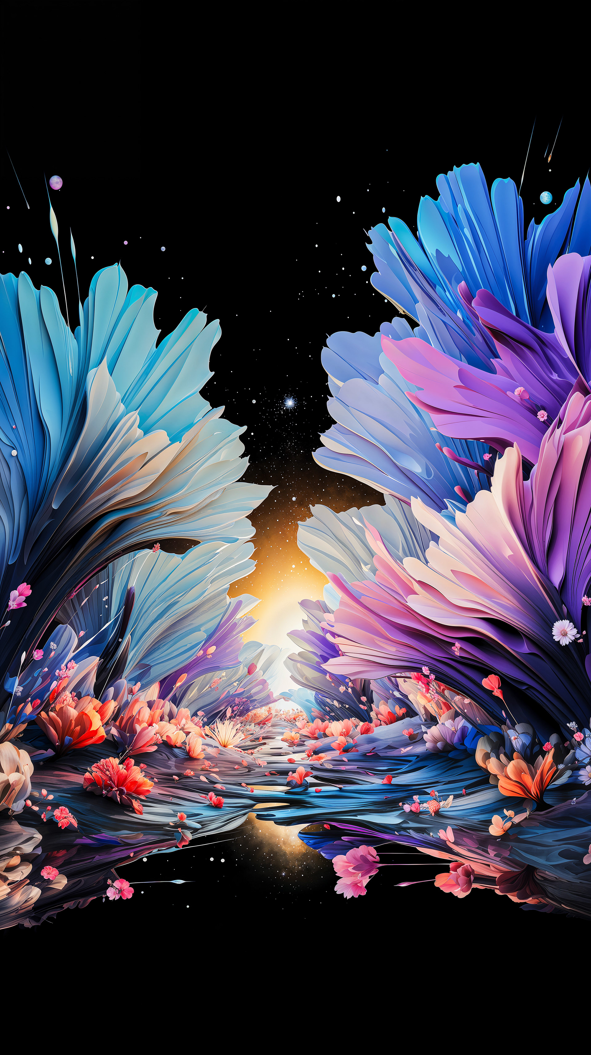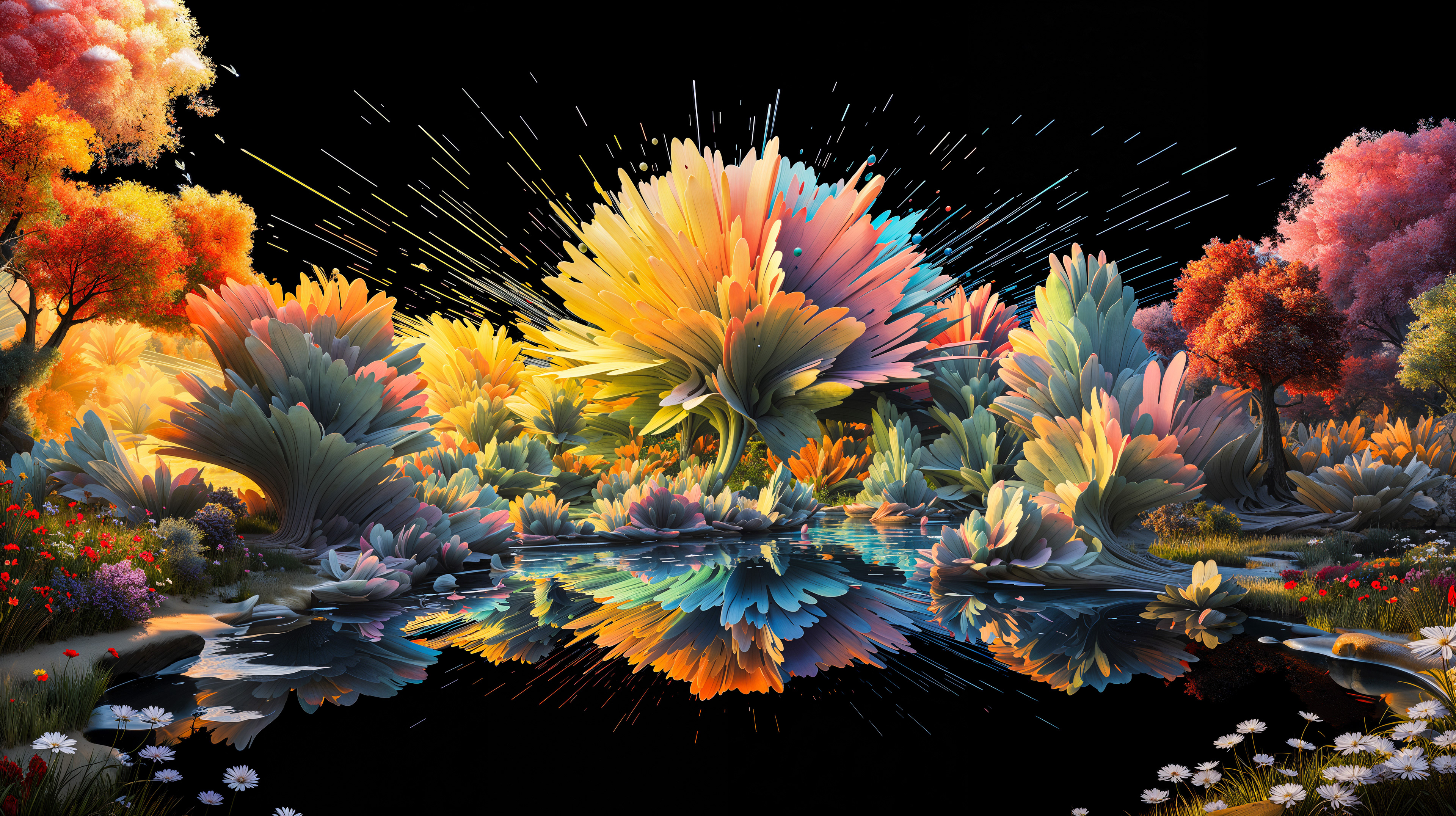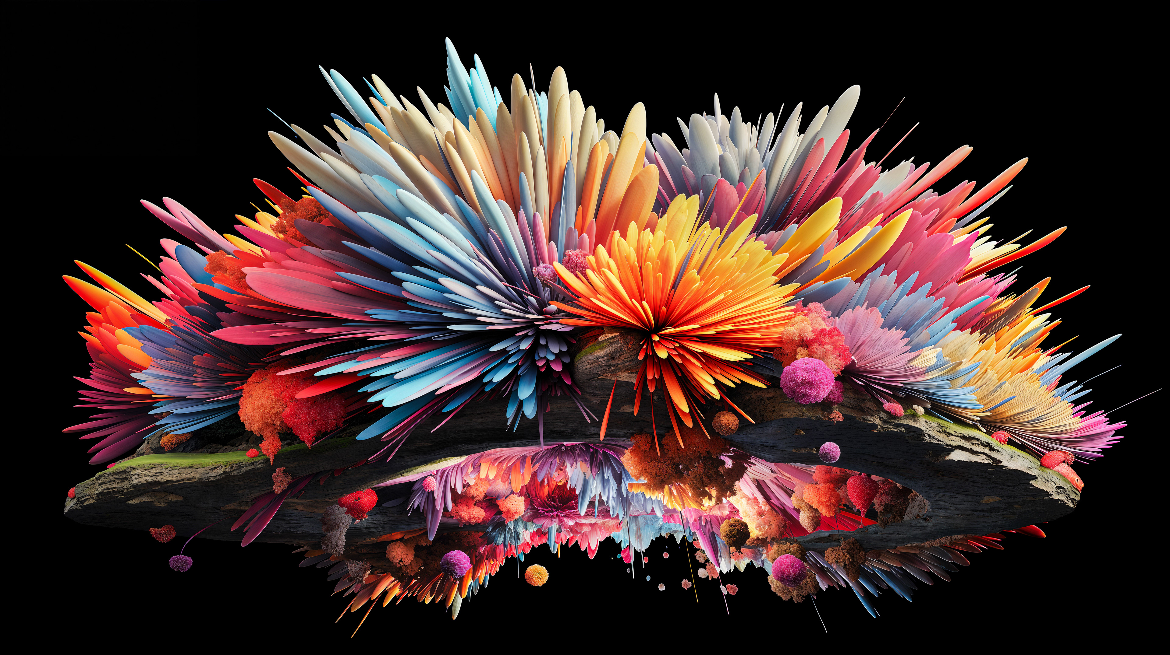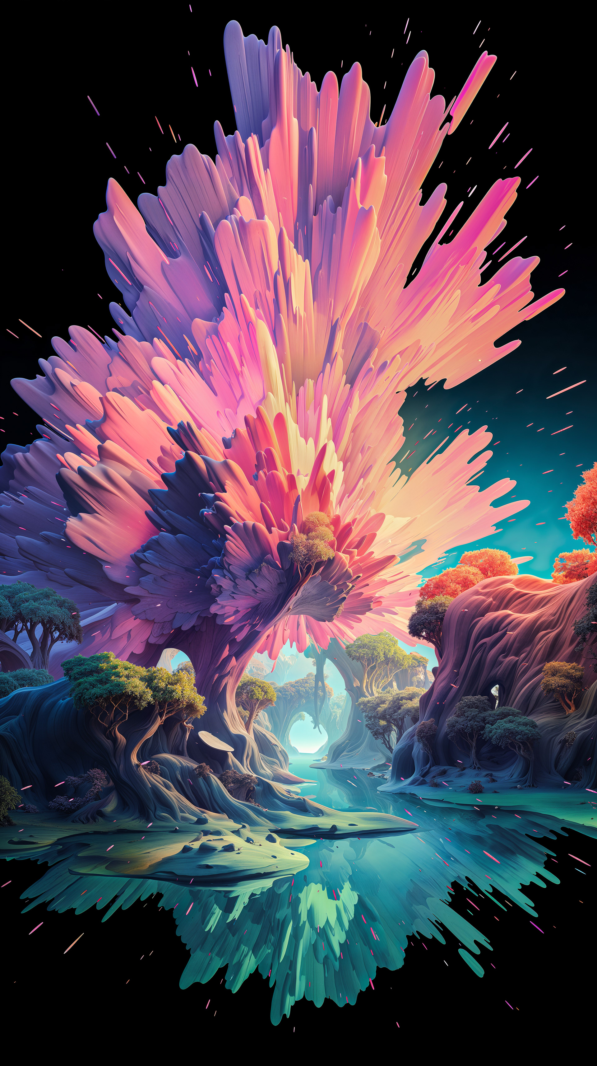 This abstract series captures organic forms in a moment of radiant bloom. Petals and crystal-like structures unfold in vivid layers of color, reflecting across fluid surfaces and dissolving into luminous motion. The works evoke growth and transformation, turning natural gestures into dreamlike compositions shaped by light and flow.