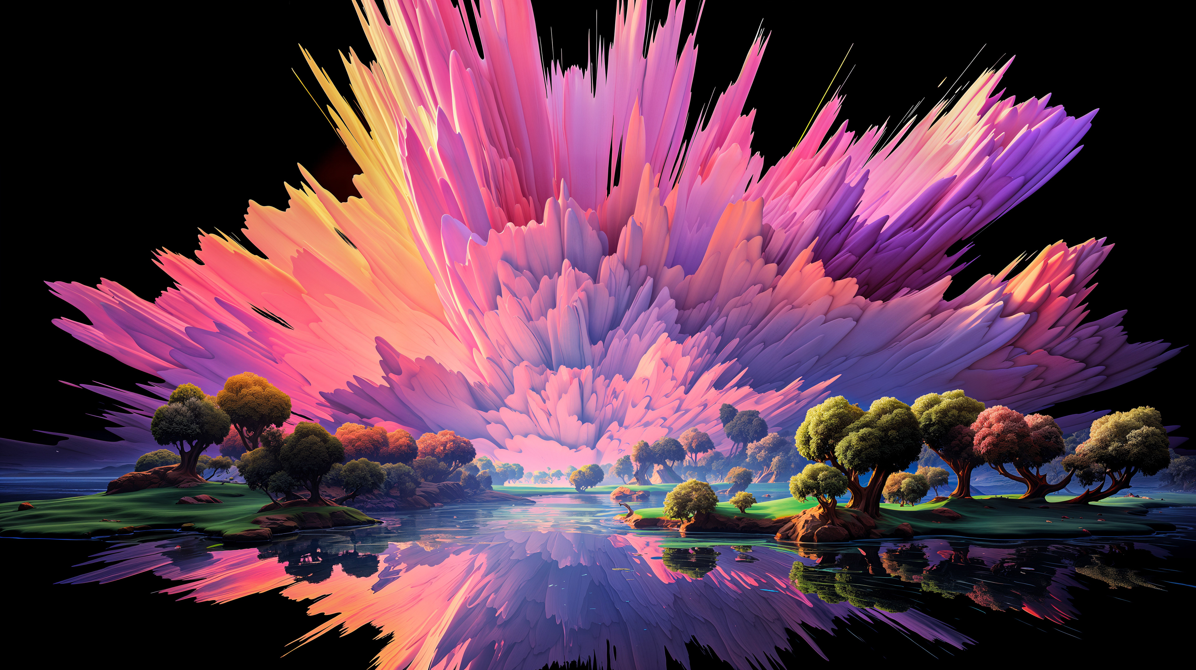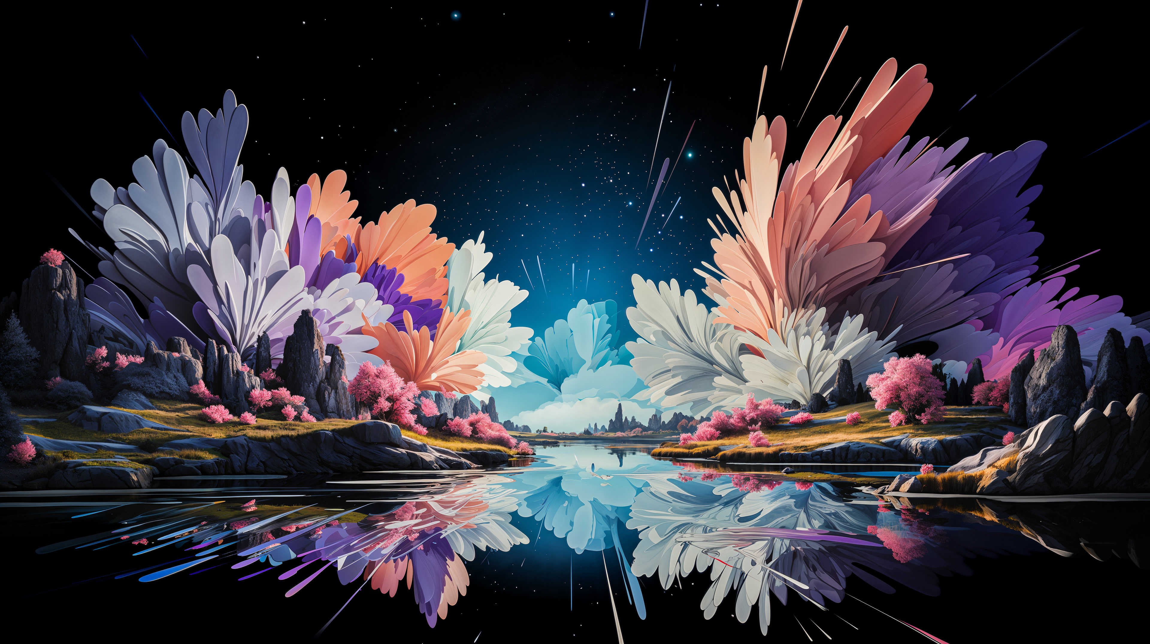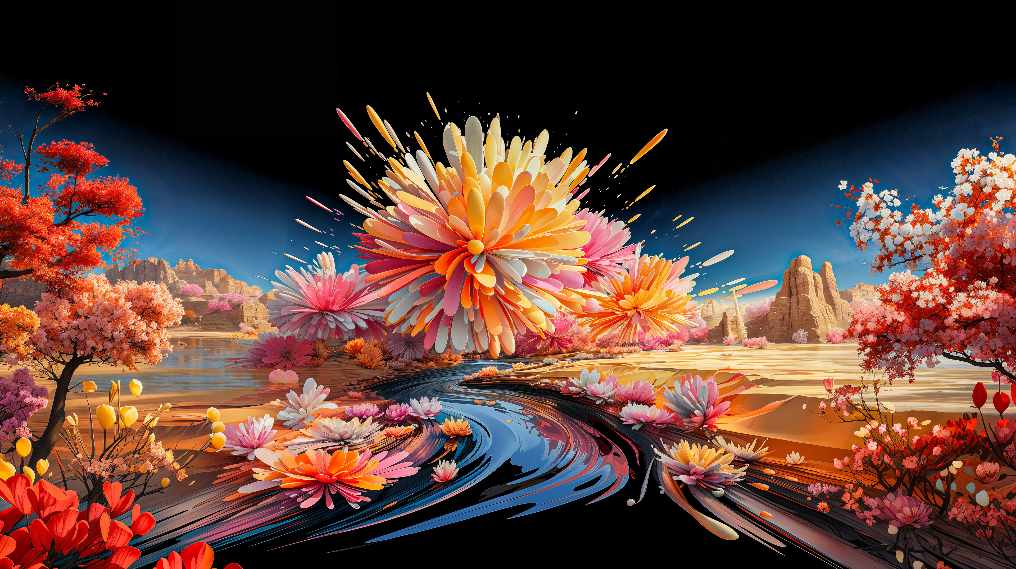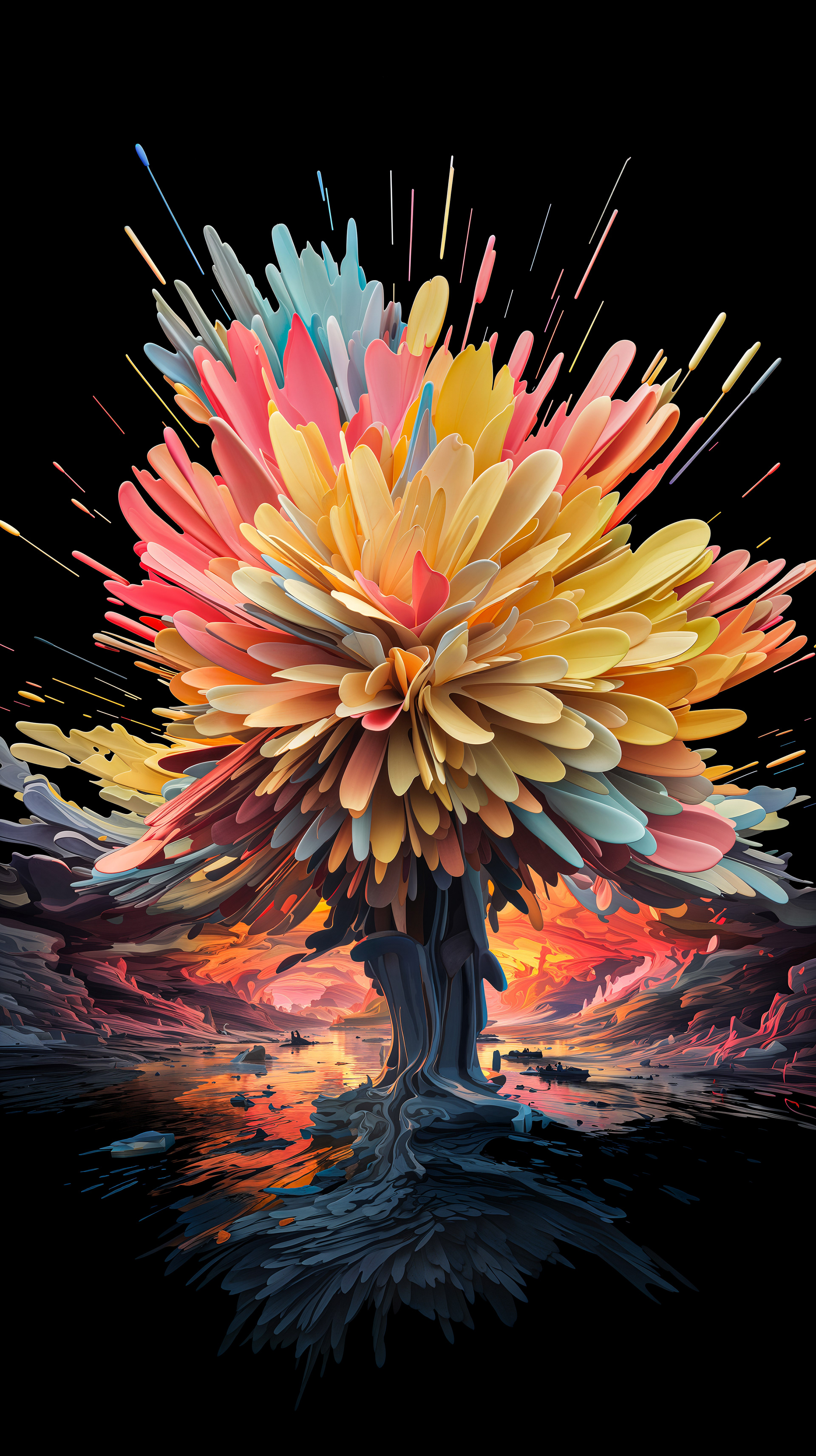 This abstract series captures organic forms in a moment of radiant bloom. Petals and crystal-like structures unfold in vivid layers of color, reflecting across fluid surfaces and dissolving into luminous motion. The works evoke growth and transformation, turning natural gestures into dreamlike compositions shaped by light and flow.