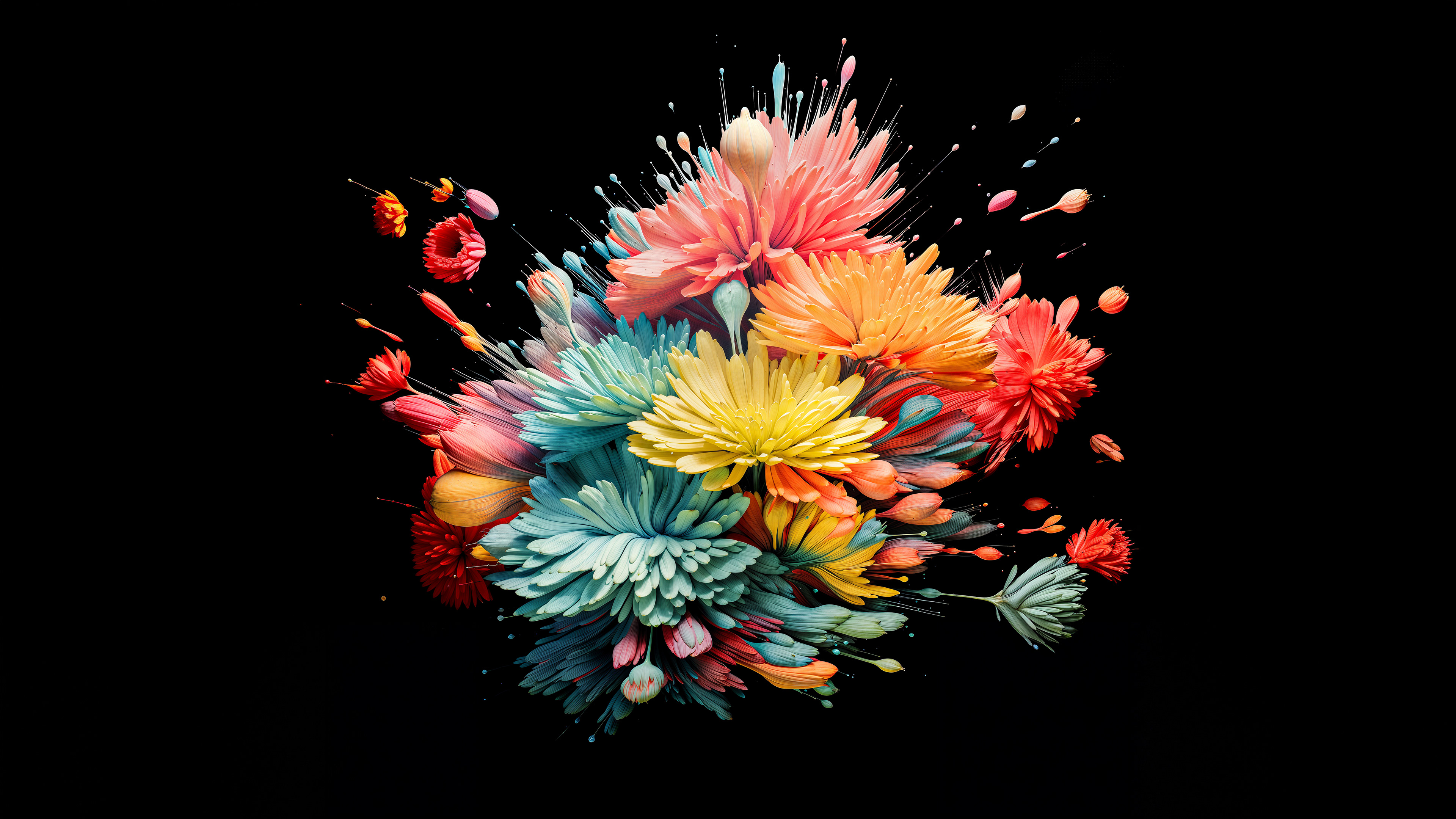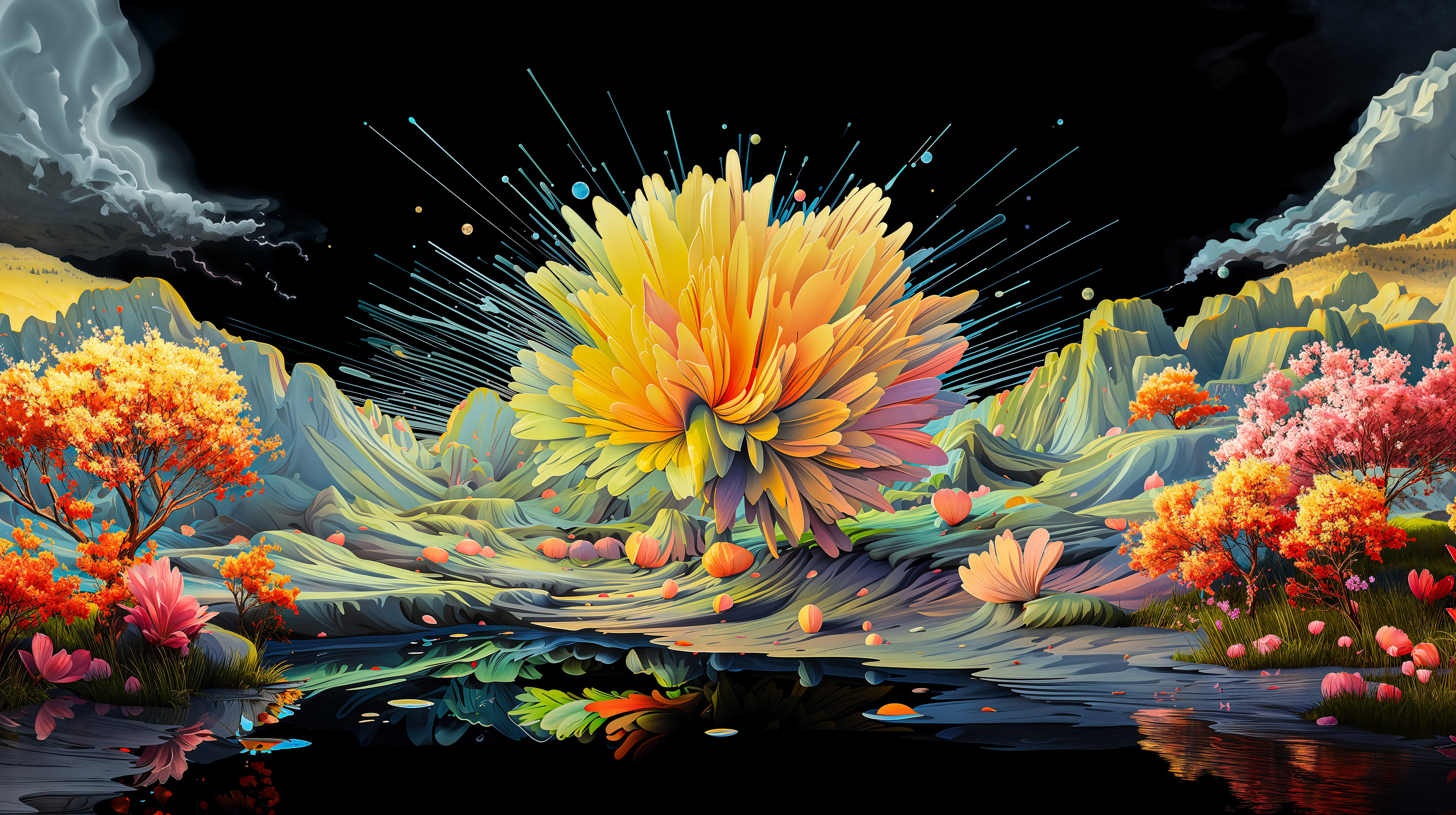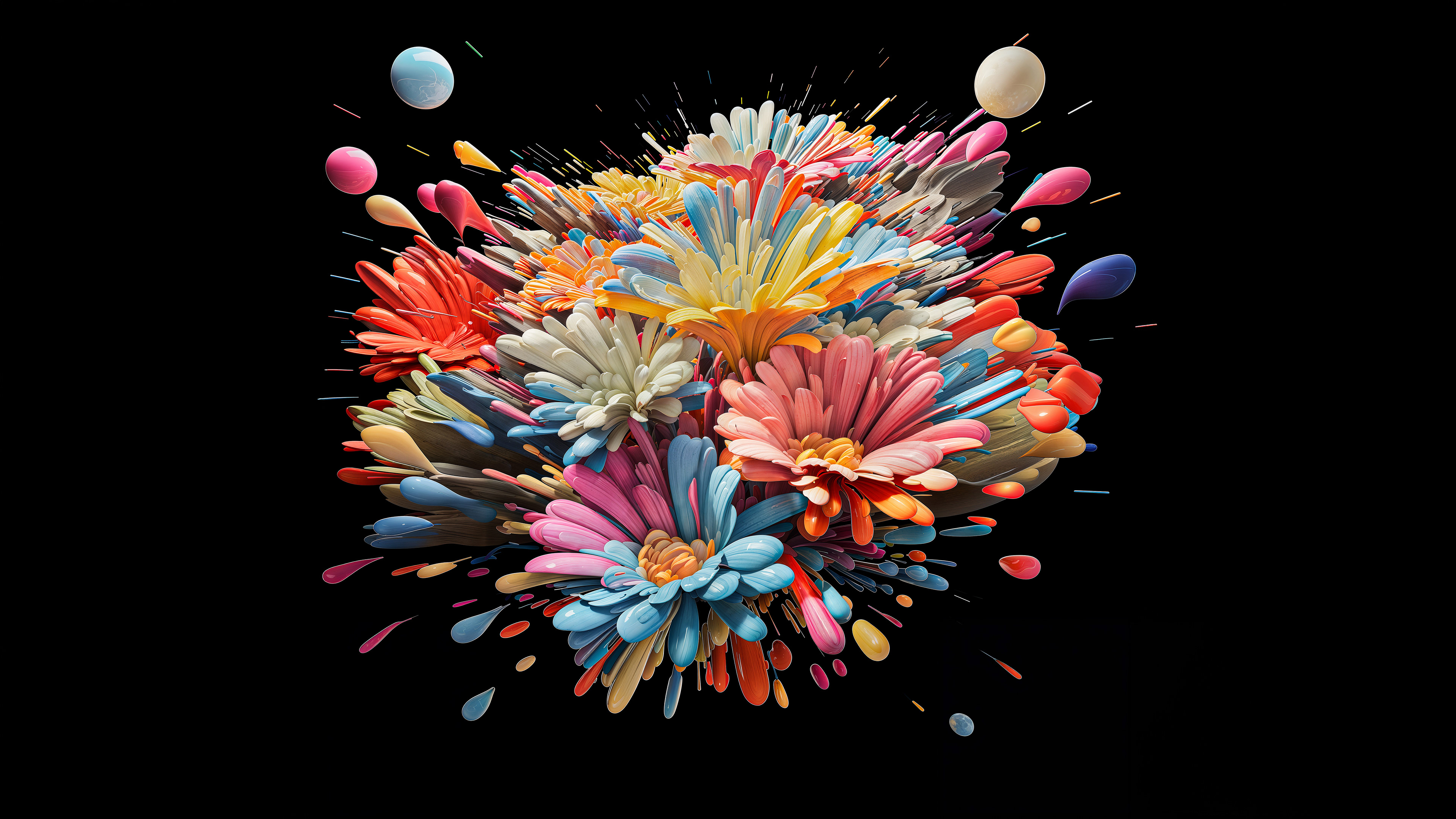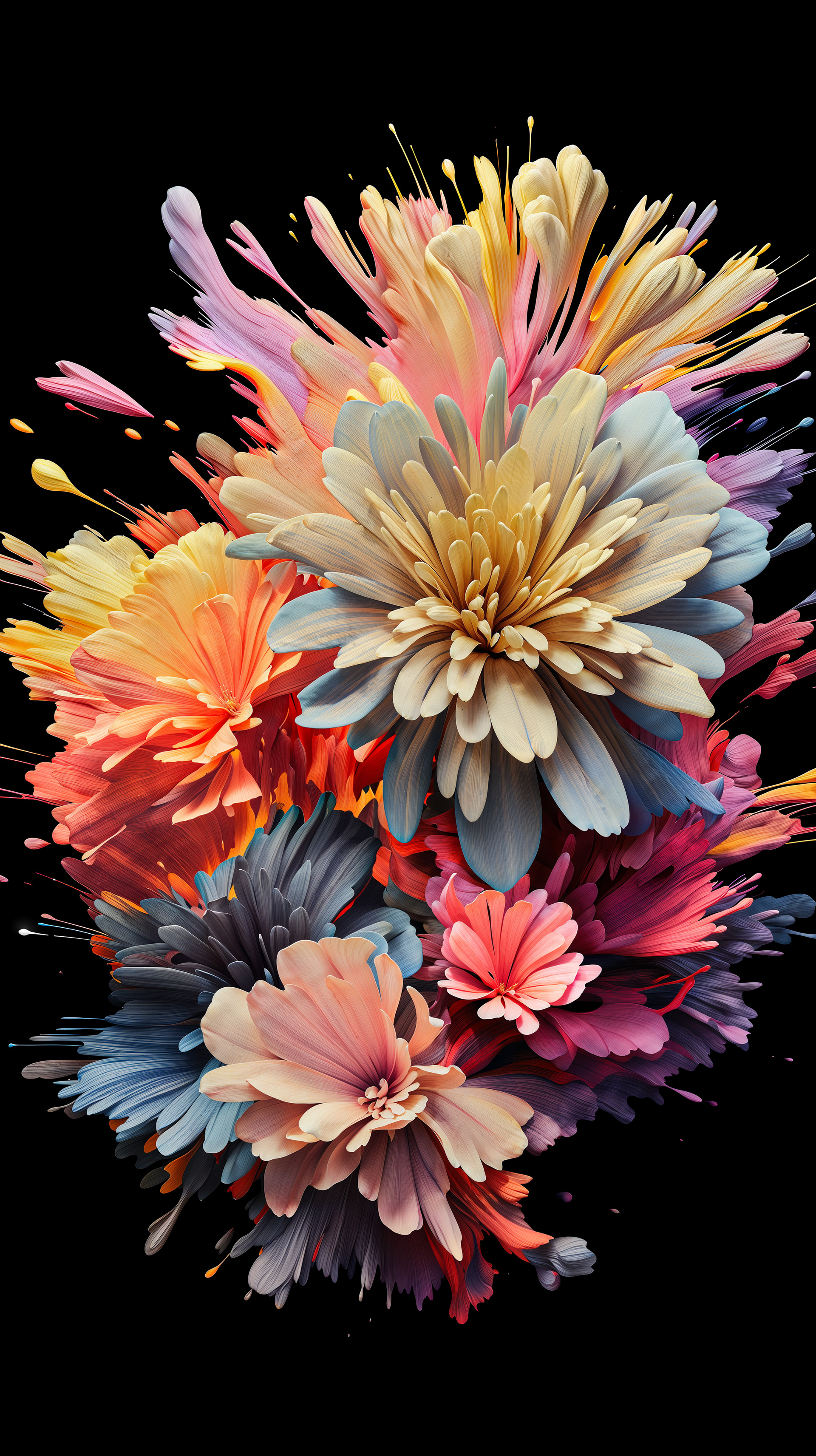 This abstract series captures organic forms in a moment of radiant bloom. Petals and crystal-like structures unfold in vivid layers of color, reflecting across fluid surfaces and dissolving into luminous motion. The works evoke growth and transformation, turning natural gestures into dreamlike compositions shaped by light and flow.