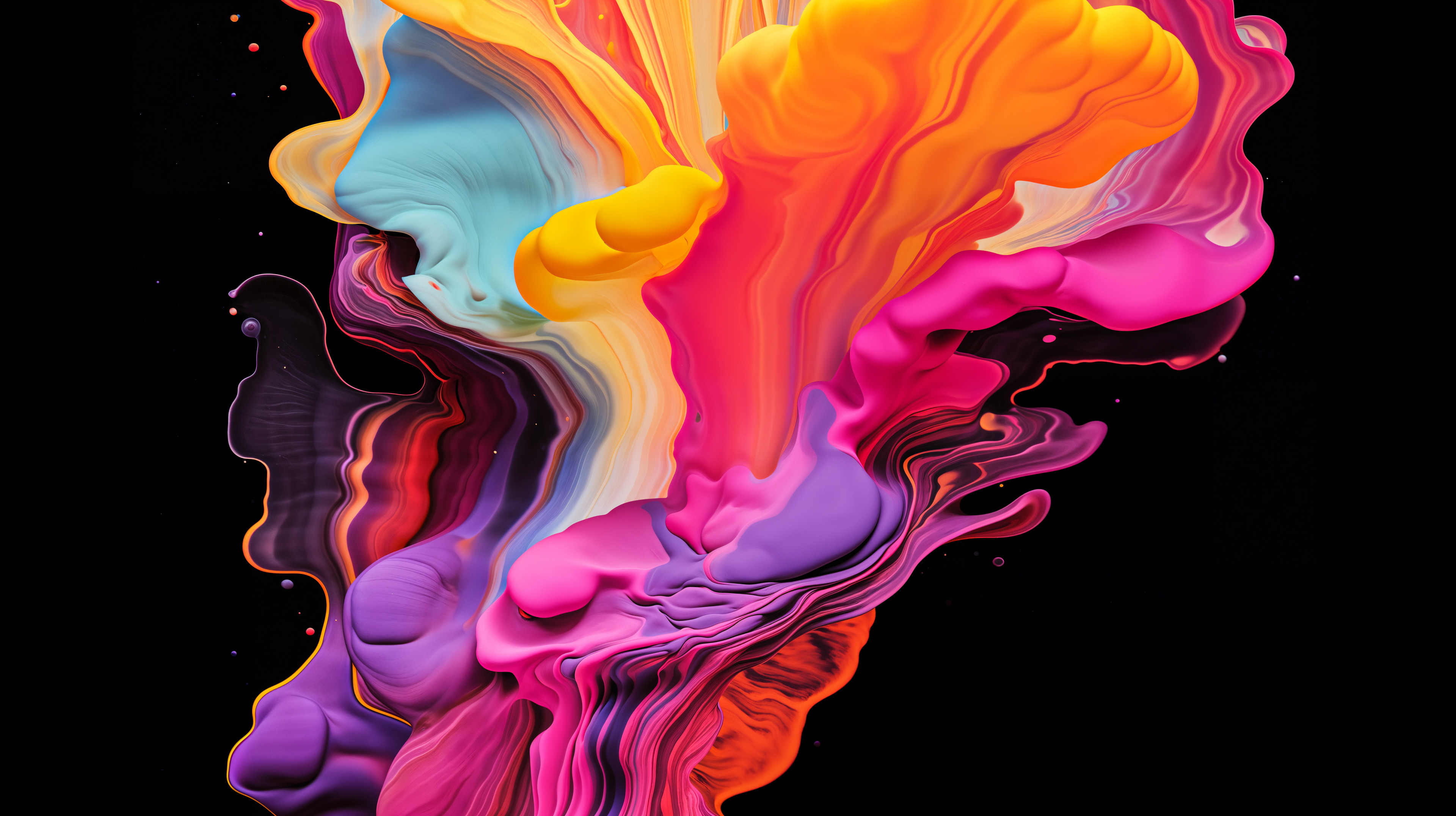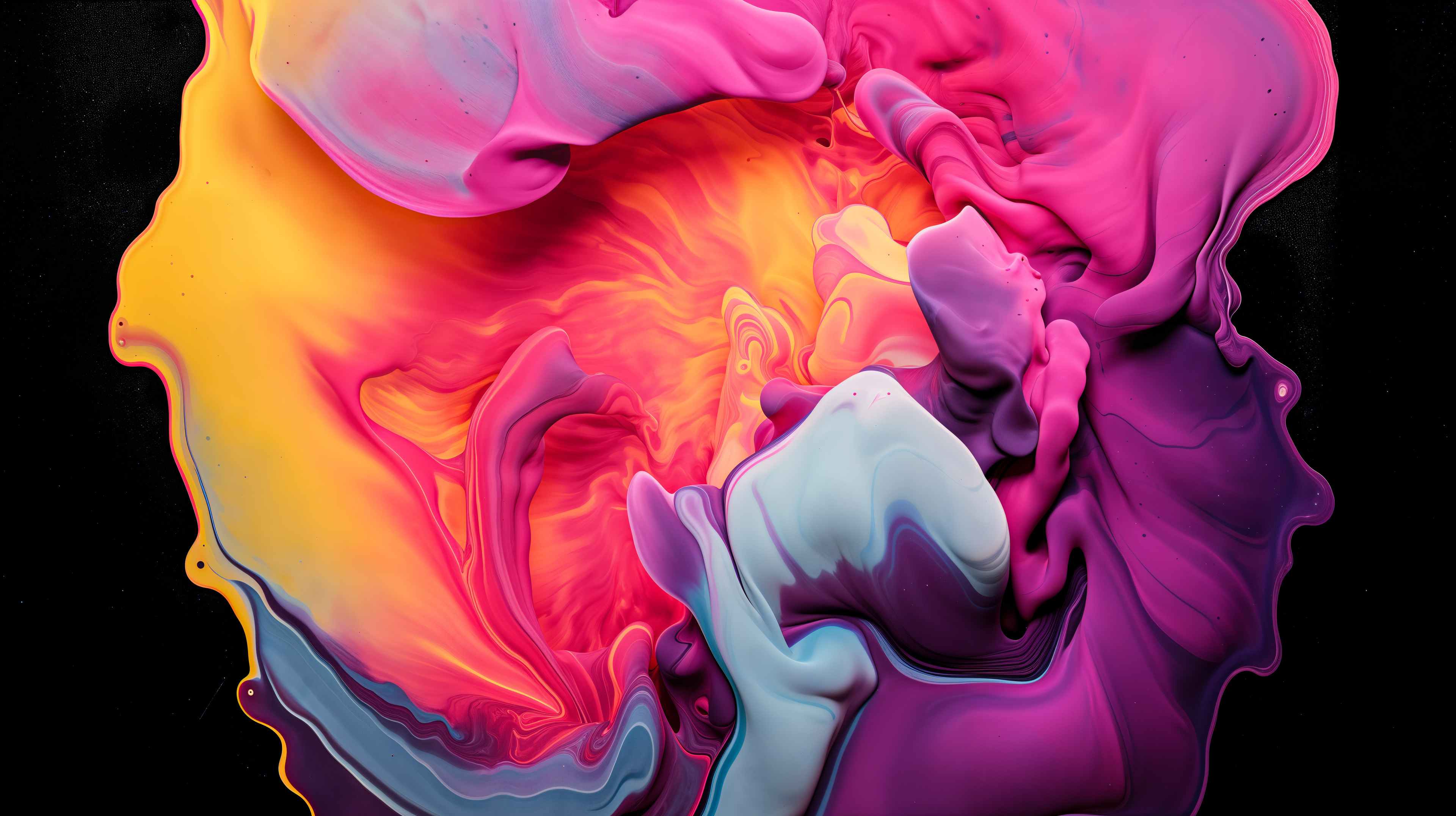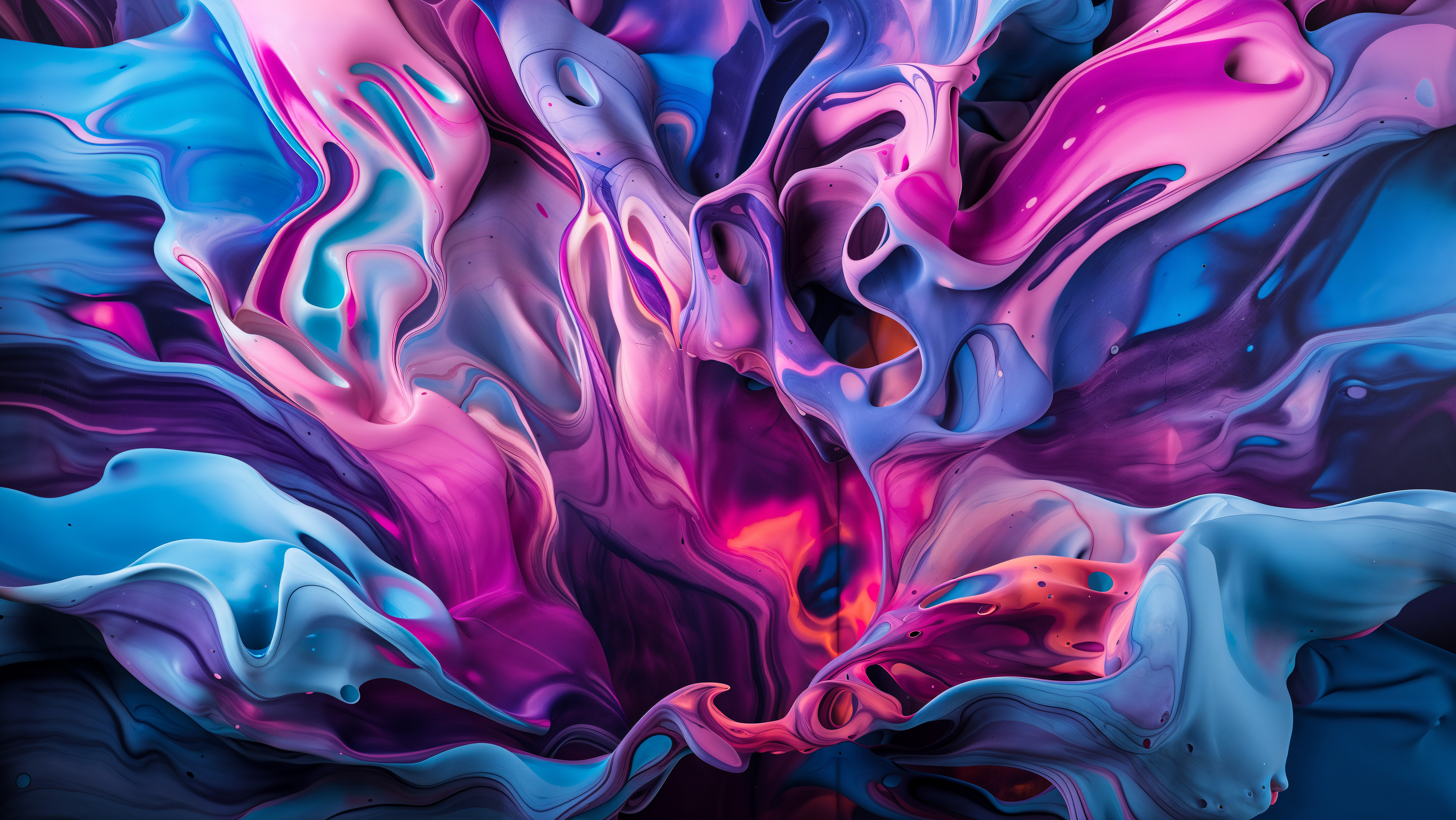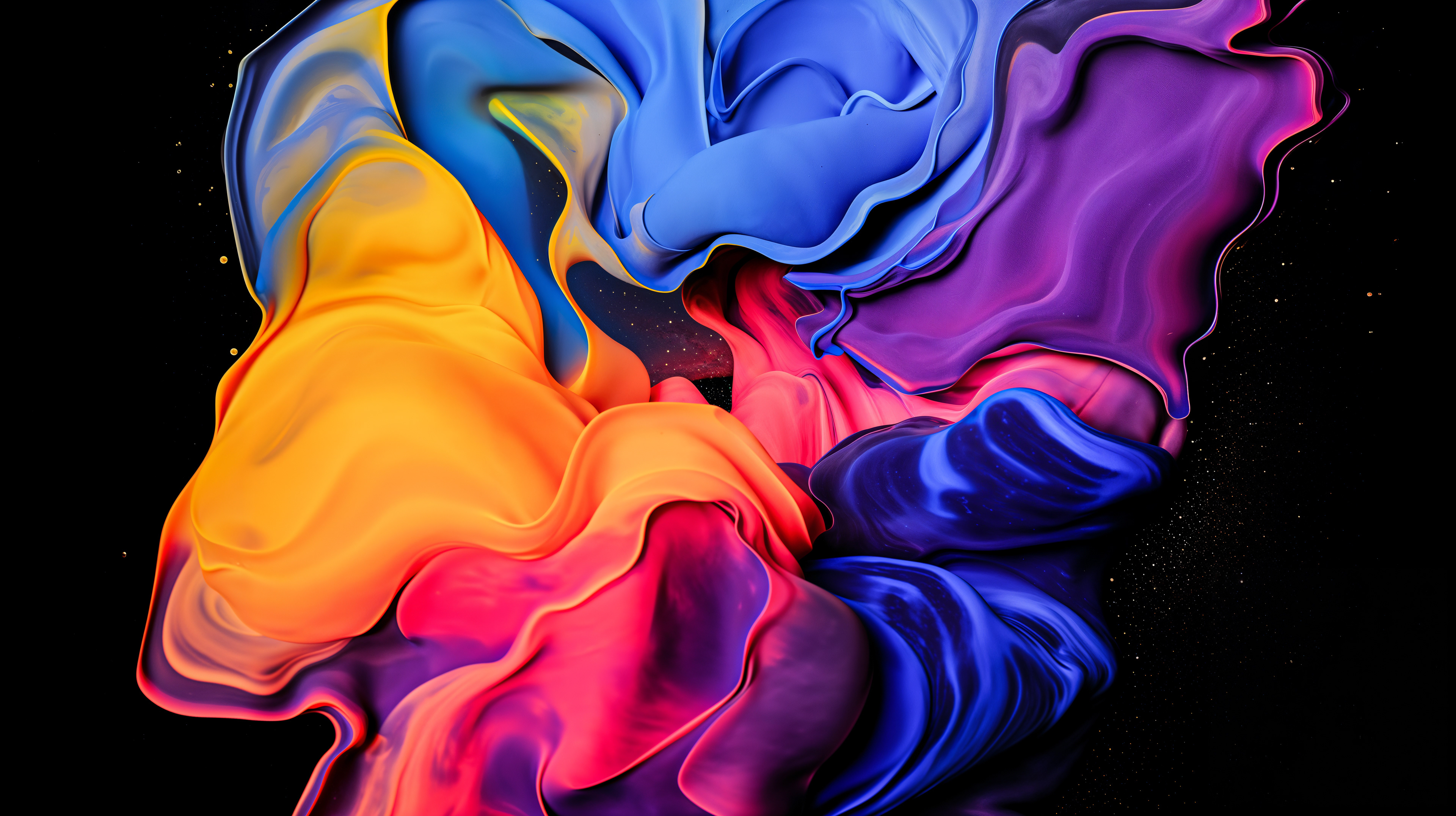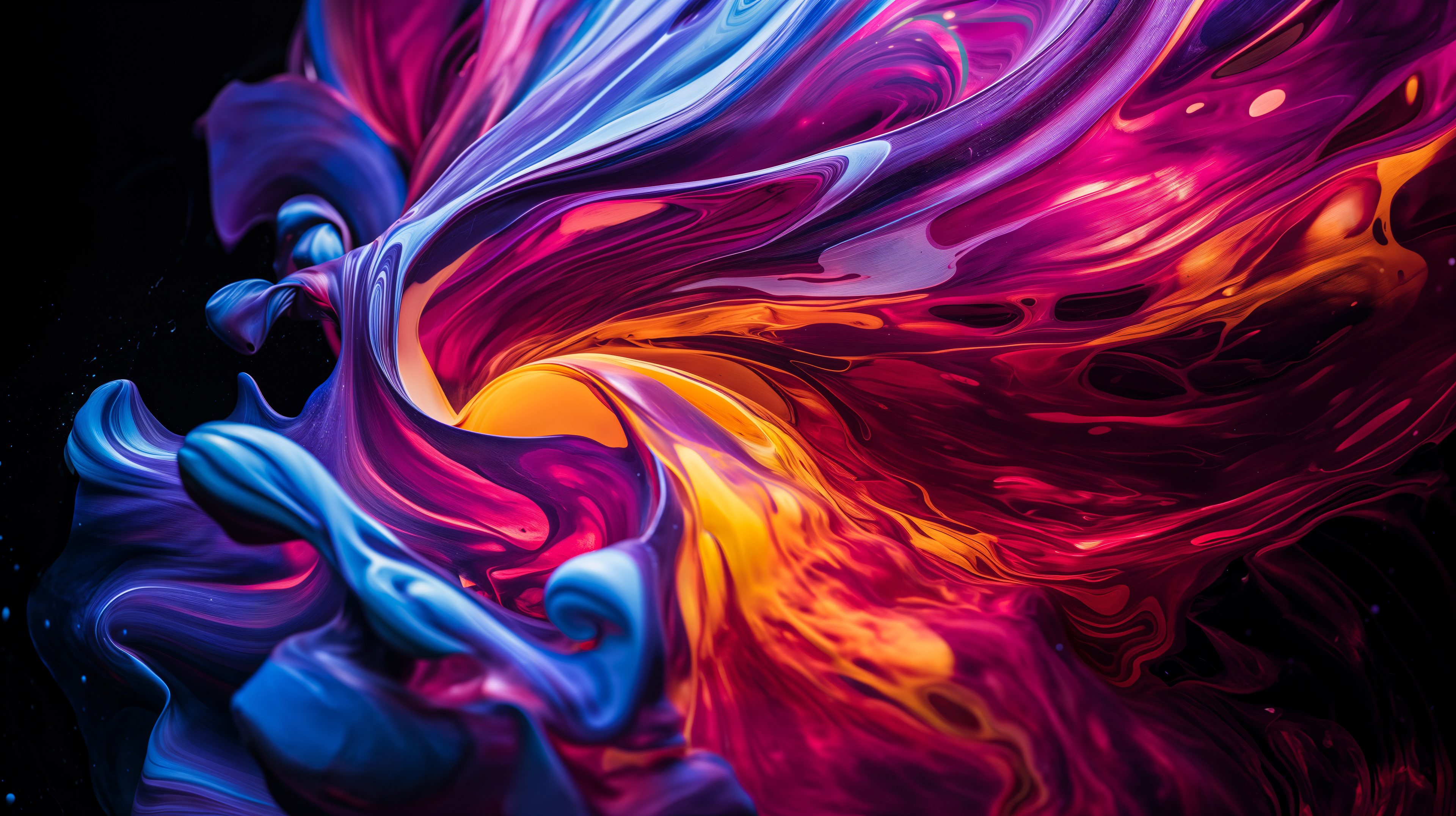This abstract video and image series explodes into drifting clouds of molten color, where luminous magentas, electric blues, radiant oranges, and liquid gold fold into one another in slow, hypnotic motion. The forms feel both cosmic and visceral, like nebulae in transformation, revealing glowing depths and shifting surfaces that pulse with hidden energy. Each frame captures a moment of alchemy, where pigment becomes light and matter dissolves into pure movement.