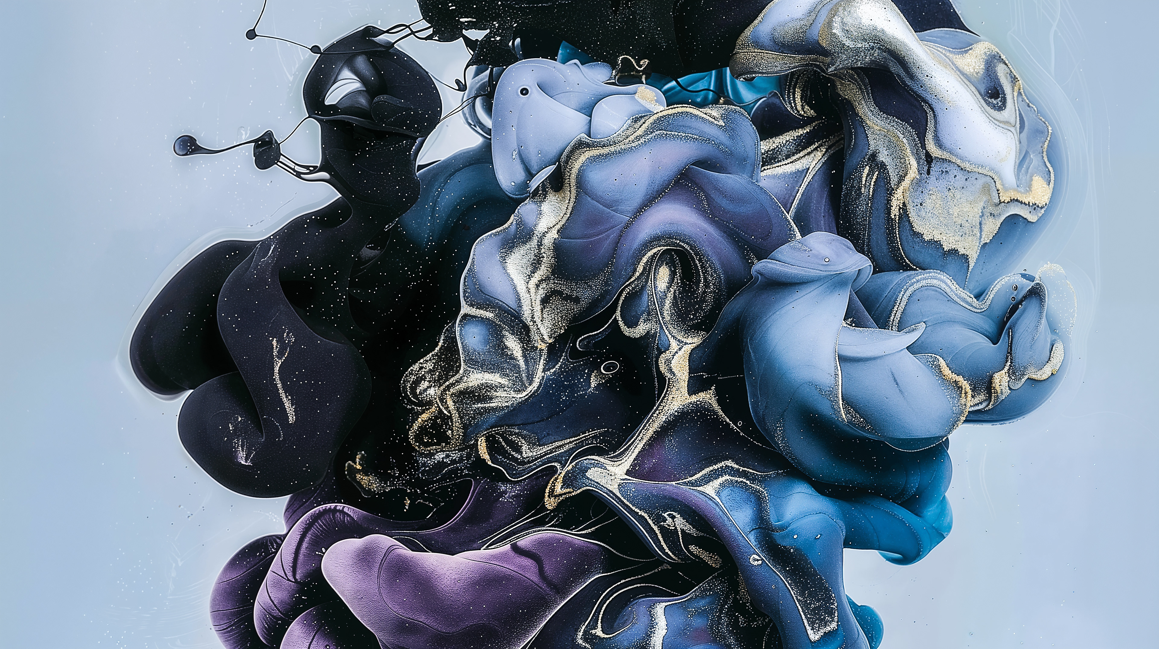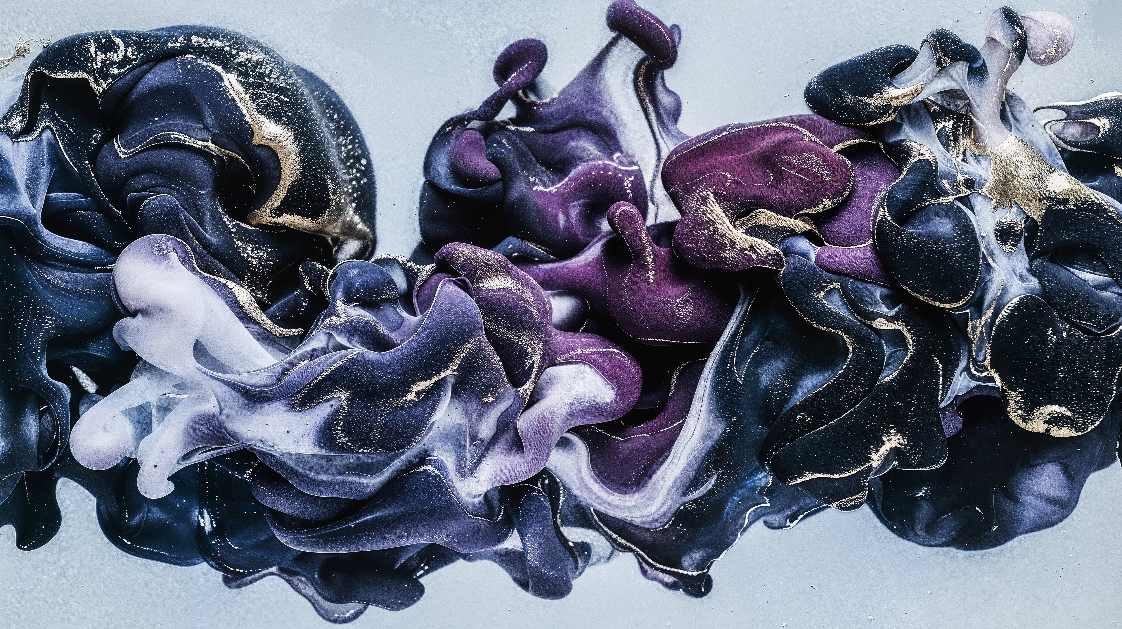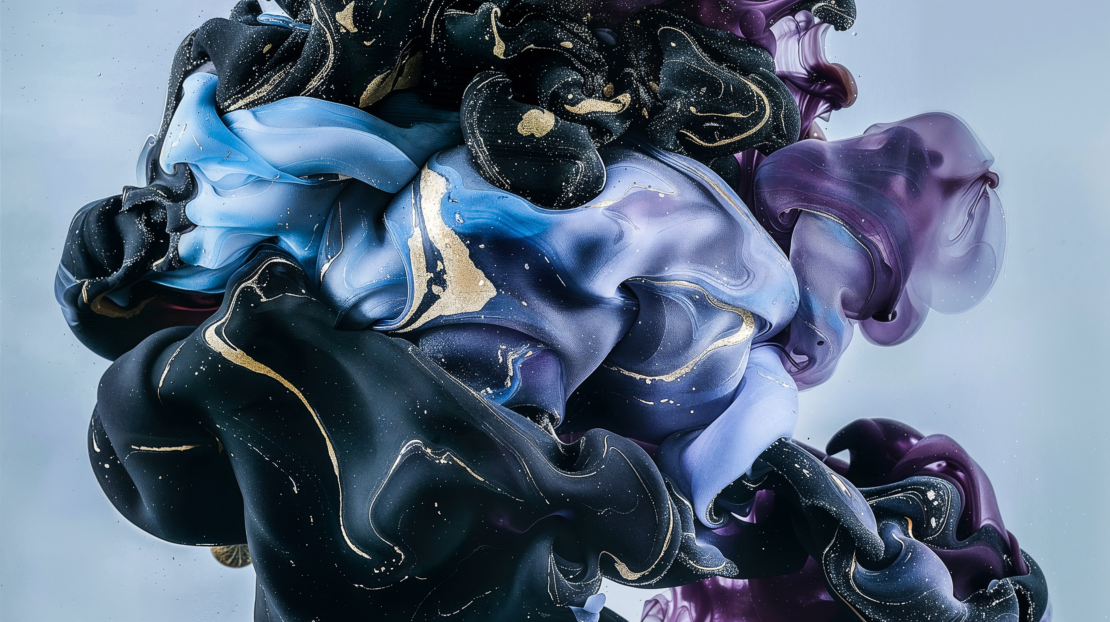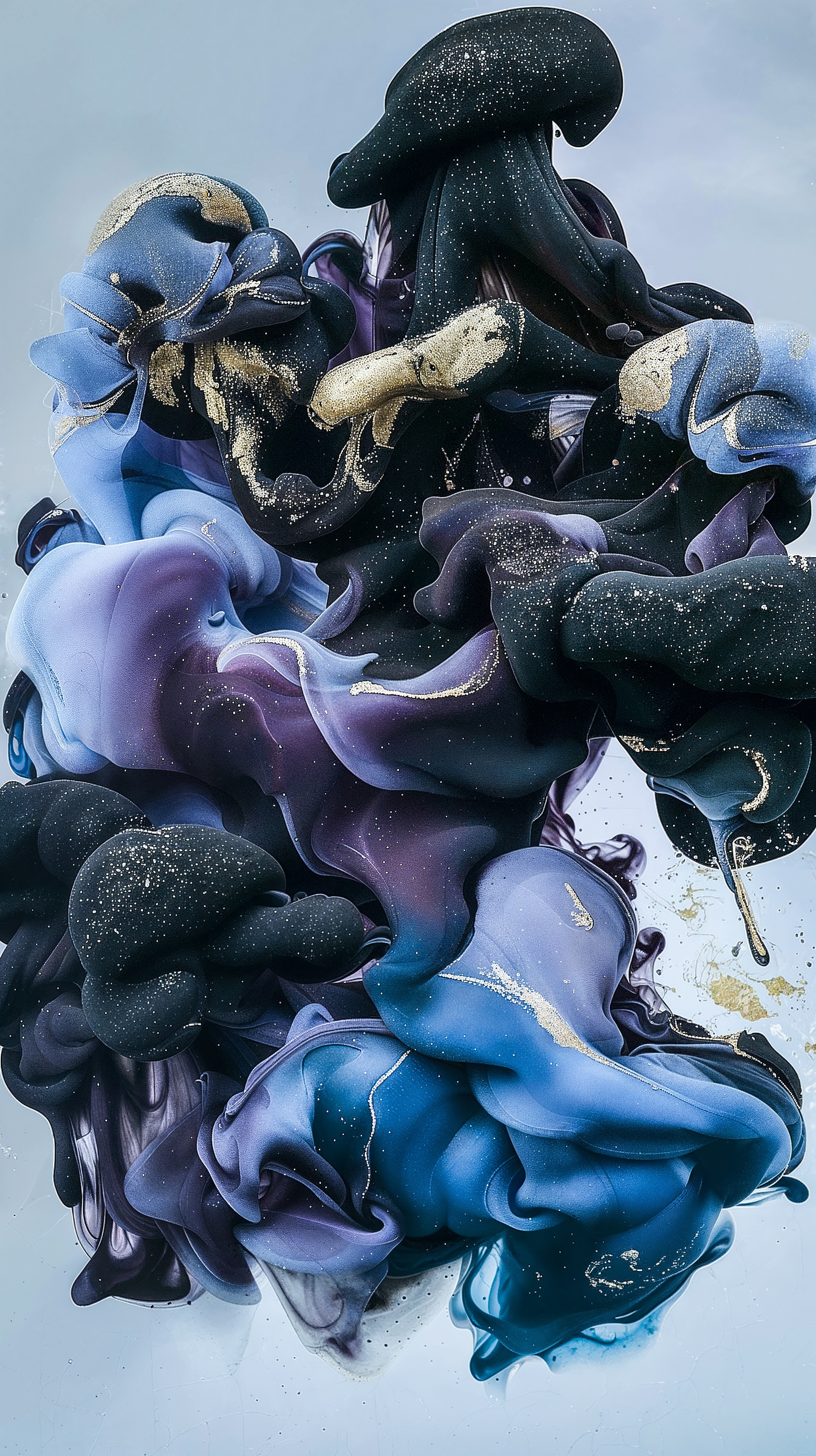 This abstract video and image series drifts through velvety clouds of ink and shadow, where deep blues, violets, and soft silvers fold into one another with quiet intensity. Flecks of gold shimmer across fluid surfaces, suggesting cosmic dust suspended in slow motion. The forms breathe and mutate, creating a meditative space where darkness and light merge into a continuous, luminous flow.