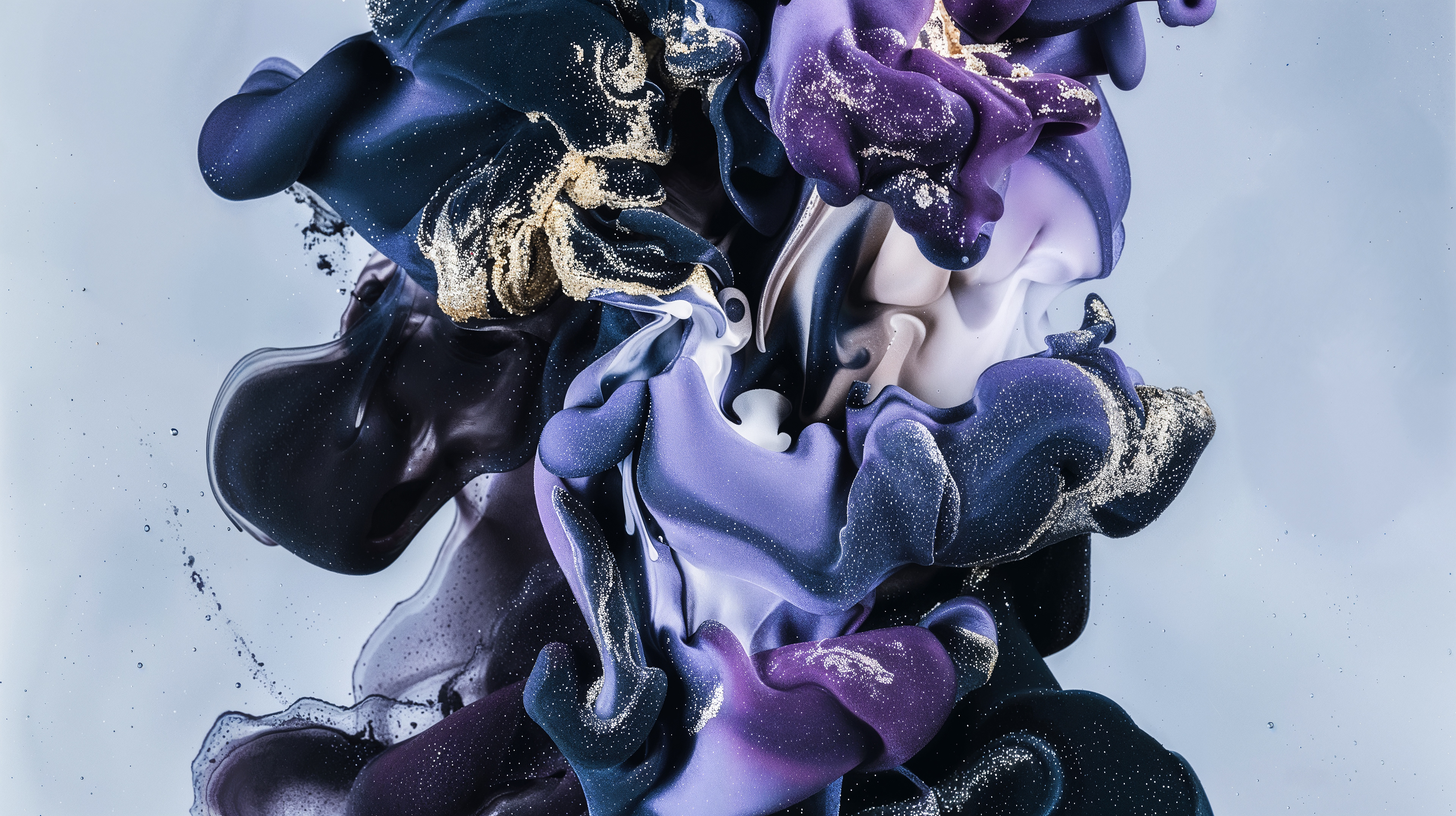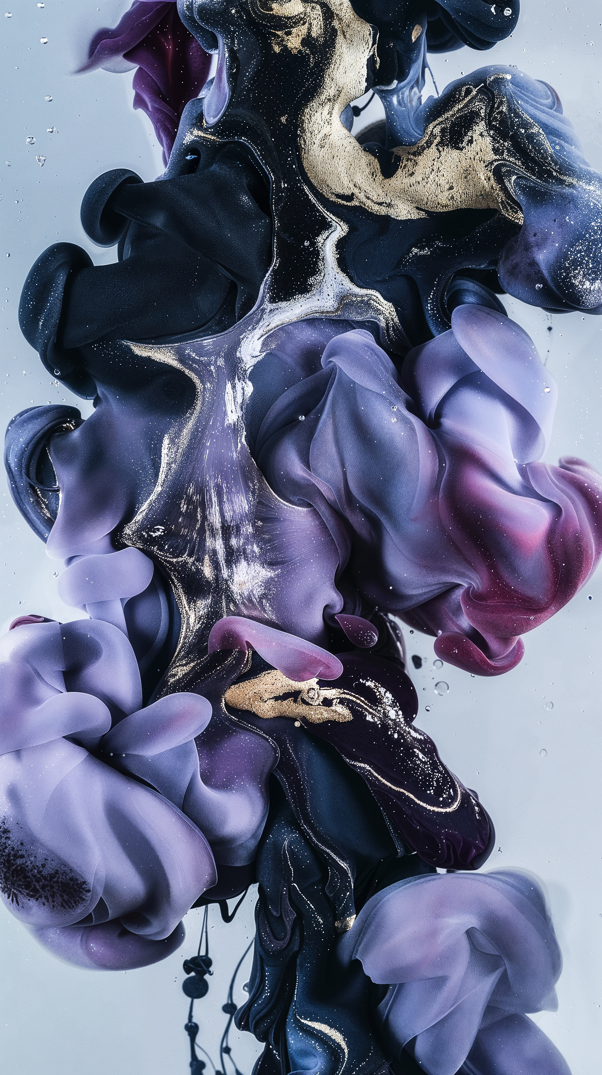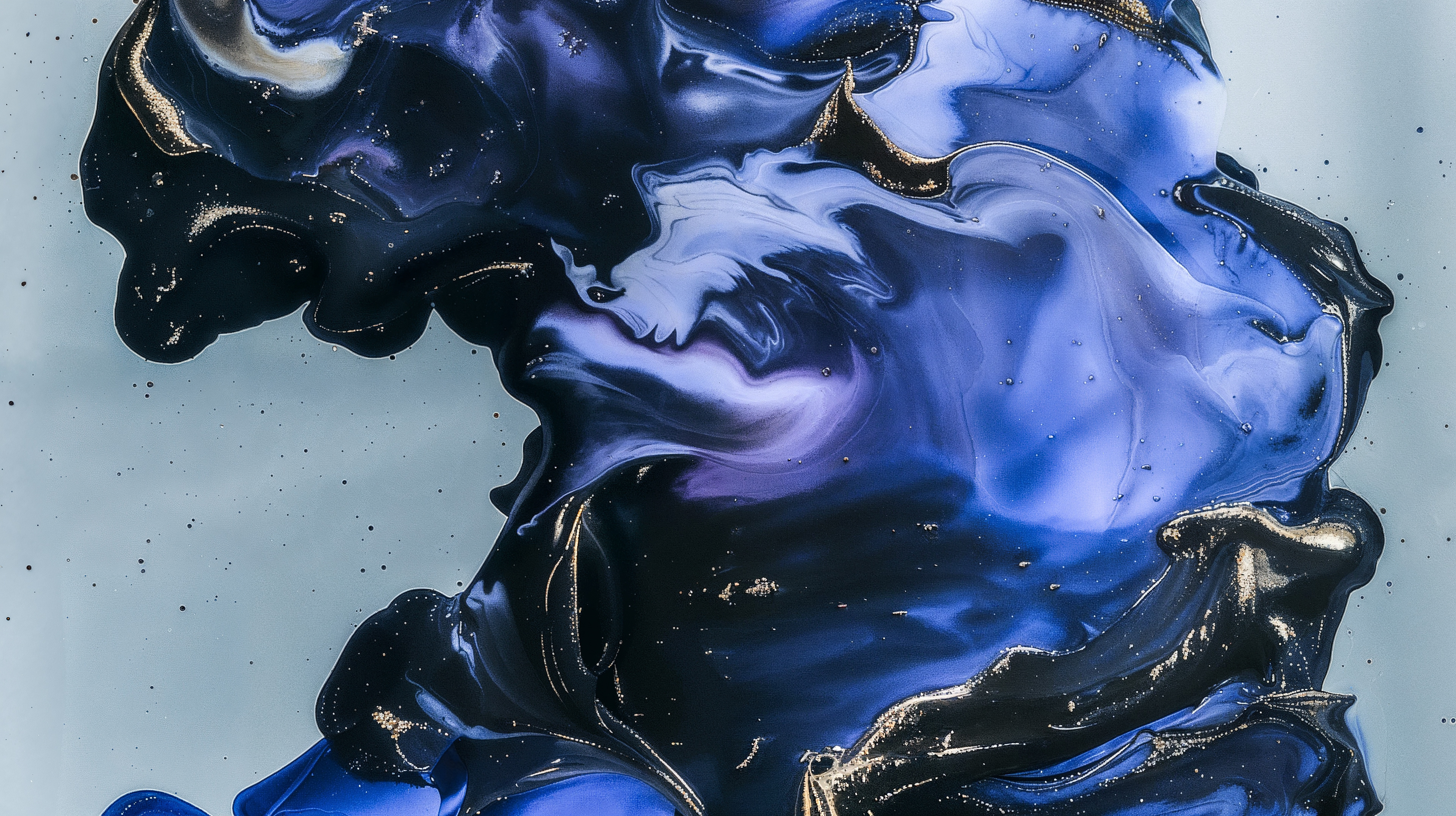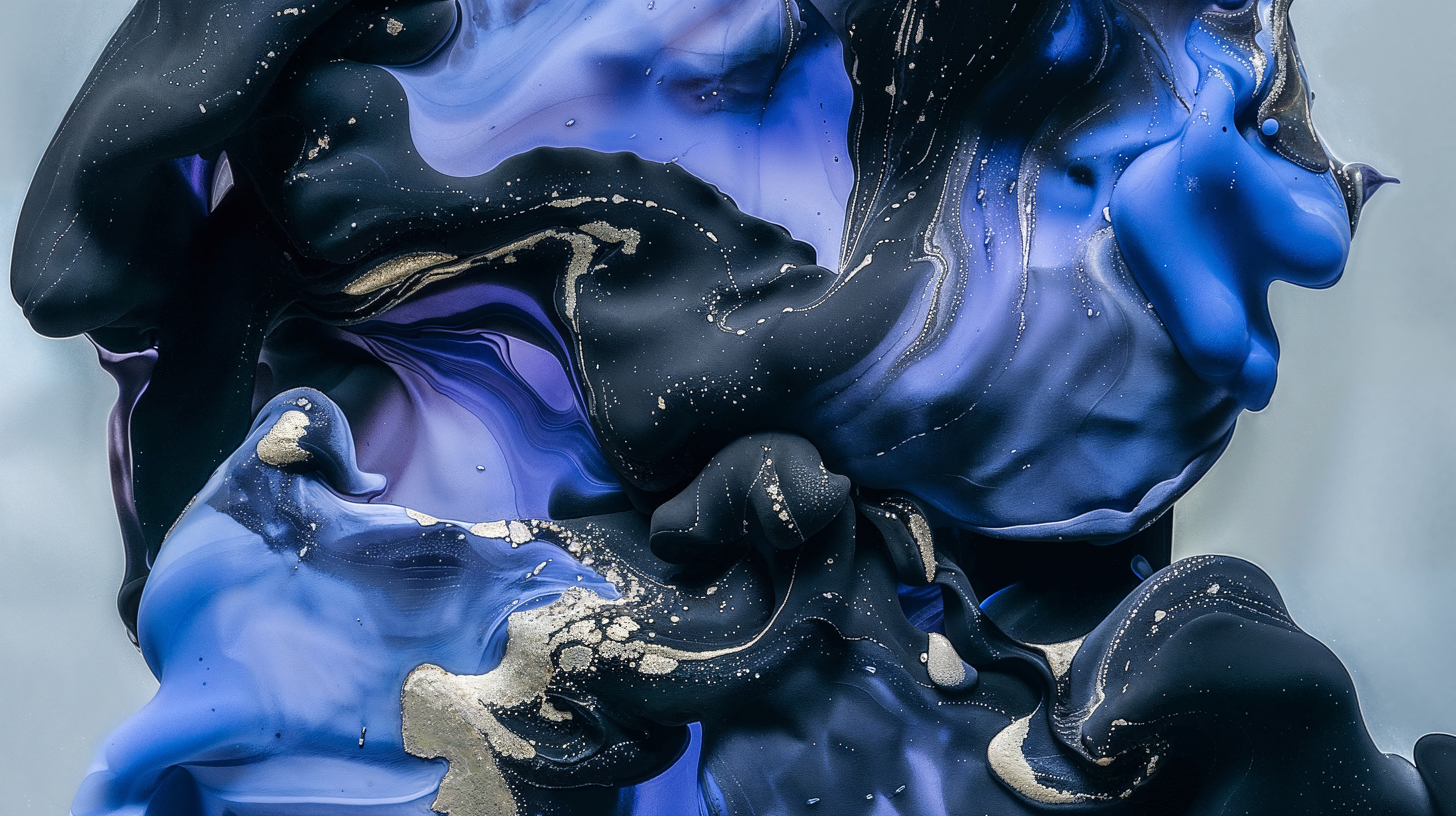 This abstract video and image series drifts through velvety clouds of ink and shadow, where deep blues, violets, and soft silvers fold into one another with quiet intensity. Flecks of gold shimmer across fluid surfaces, suggesting cosmic dust suspended in slow motion. The forms breathe and mutate, creating a meditative space where darkness and light merge into a continuous, luminous flow.