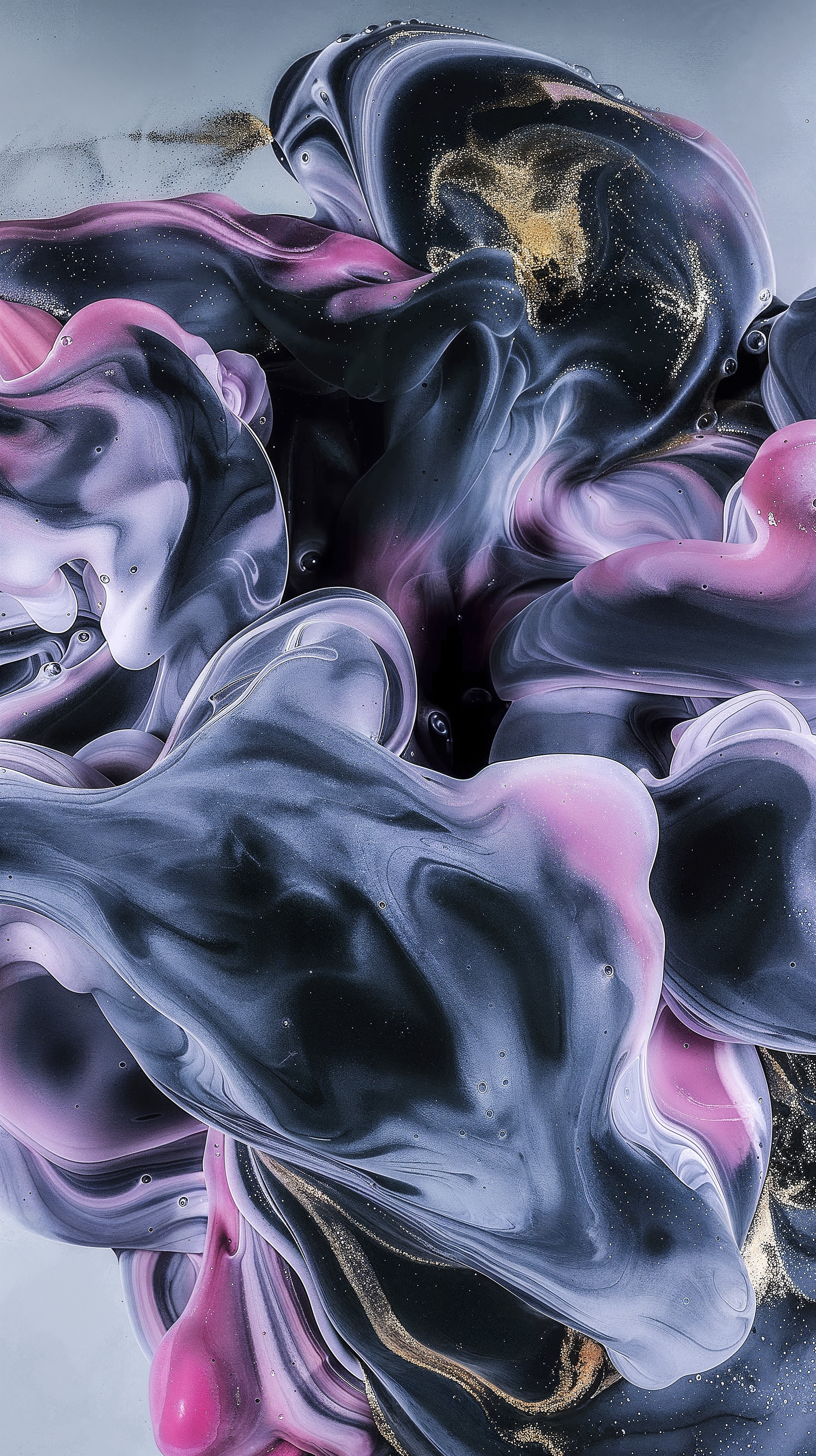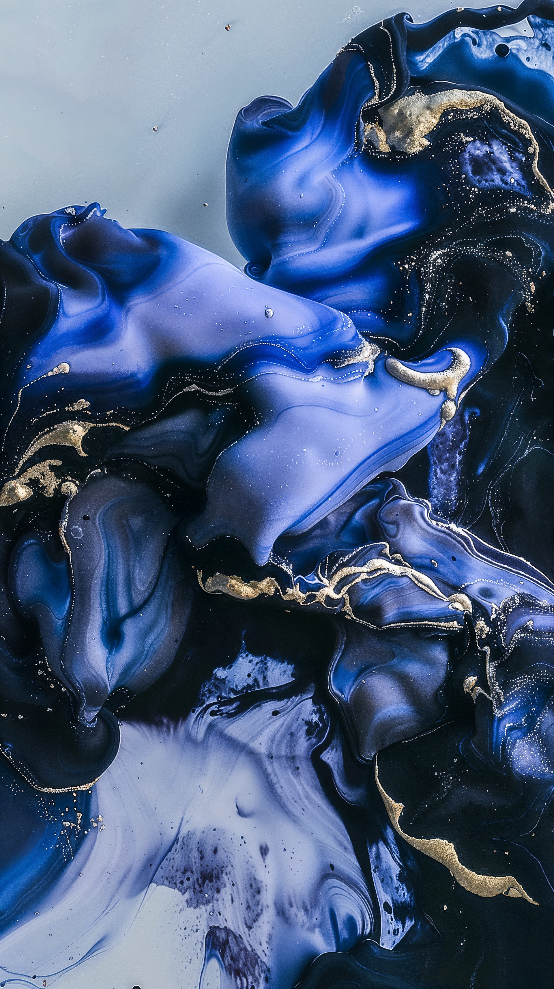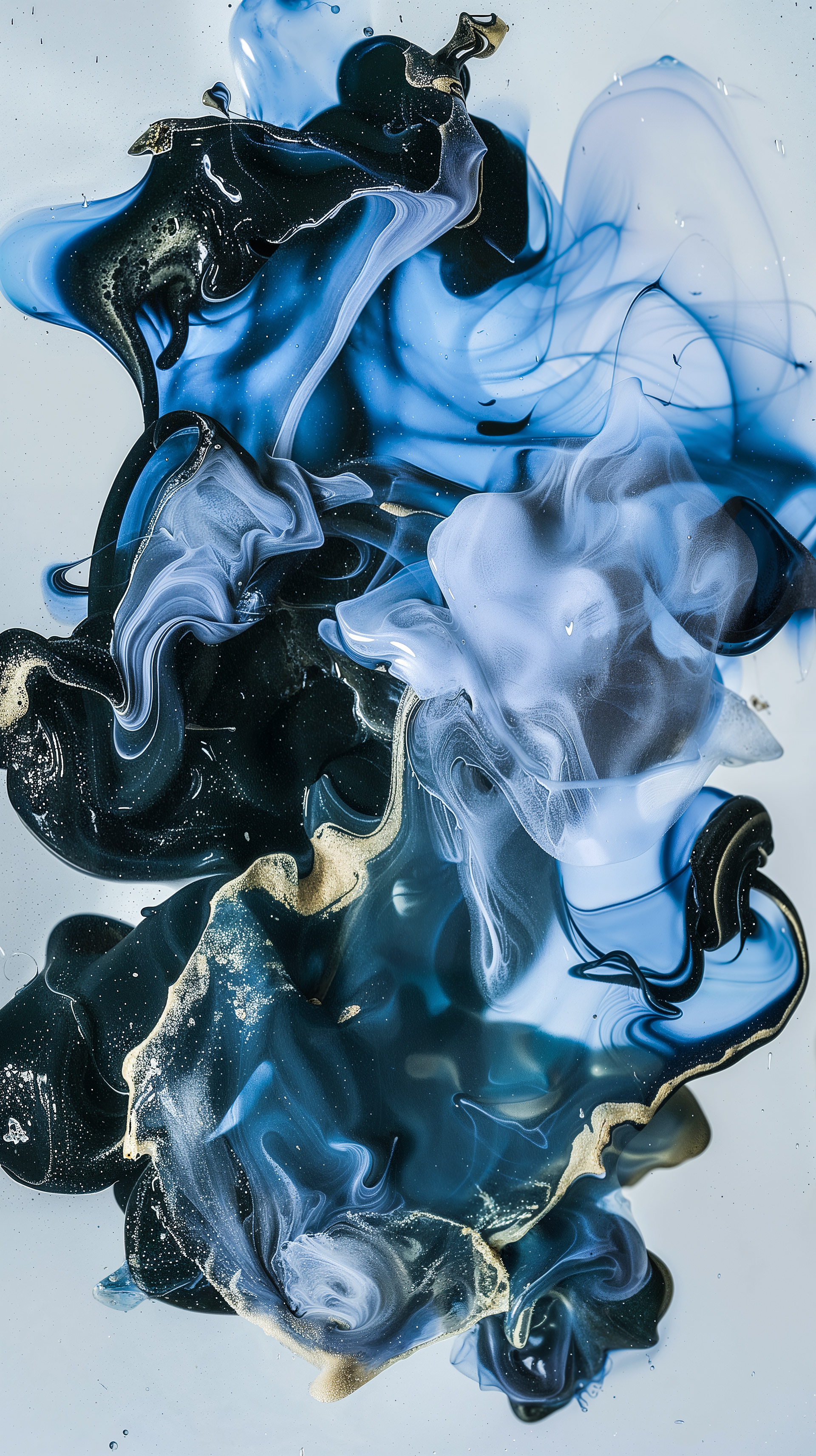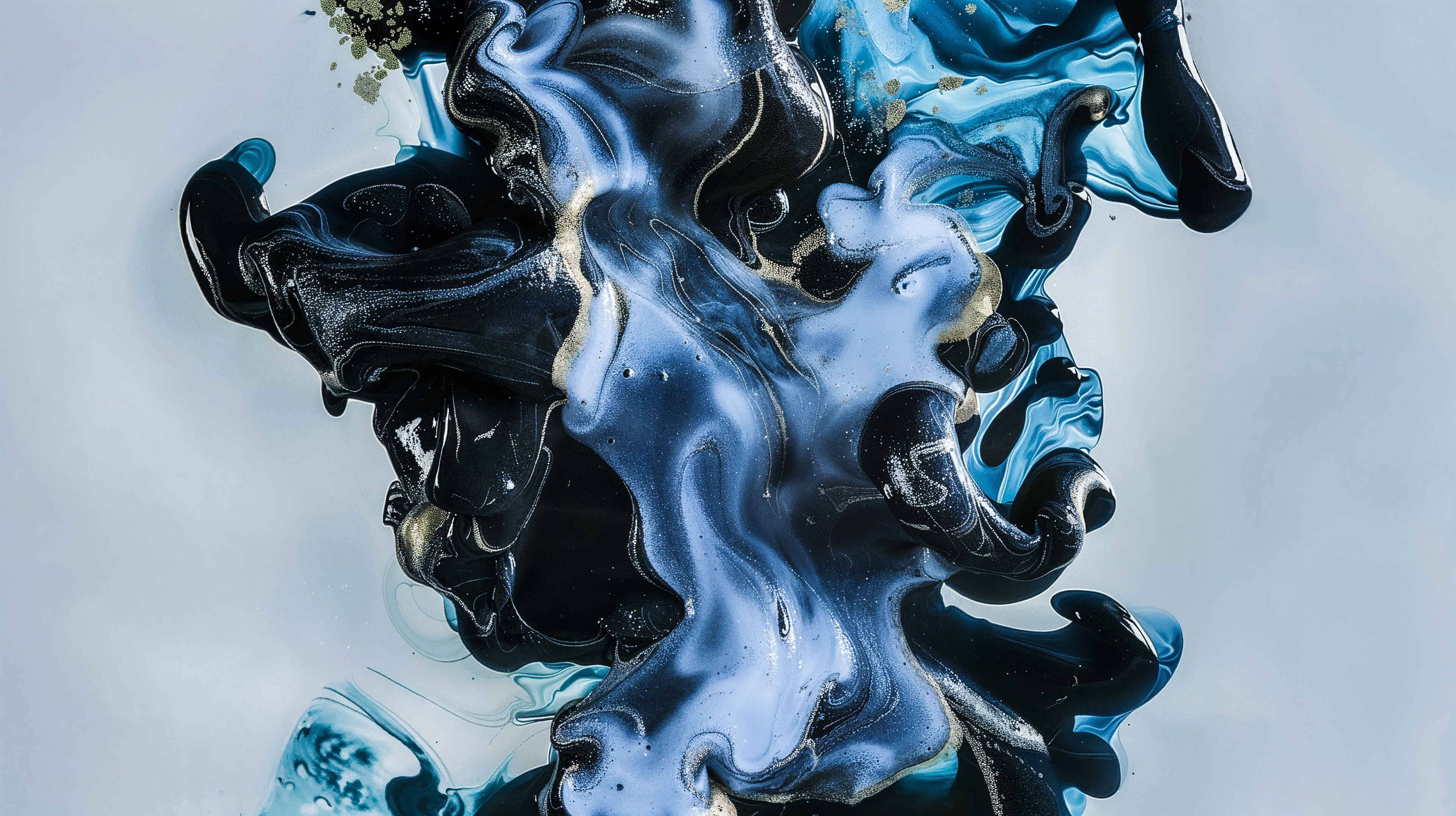 This abstract video and image series drifts through velvety clouds of ink and shadow, where deep blues, violets, and soft silvers fold into one another with quiet intensity. Flecks of gold shimmer across fluid surfaces, suggesting cosmic dust suspended in slow motion. The forms breathe and mutate, creating a meditative space where darkness and light merge into a continuous, luminous flow.