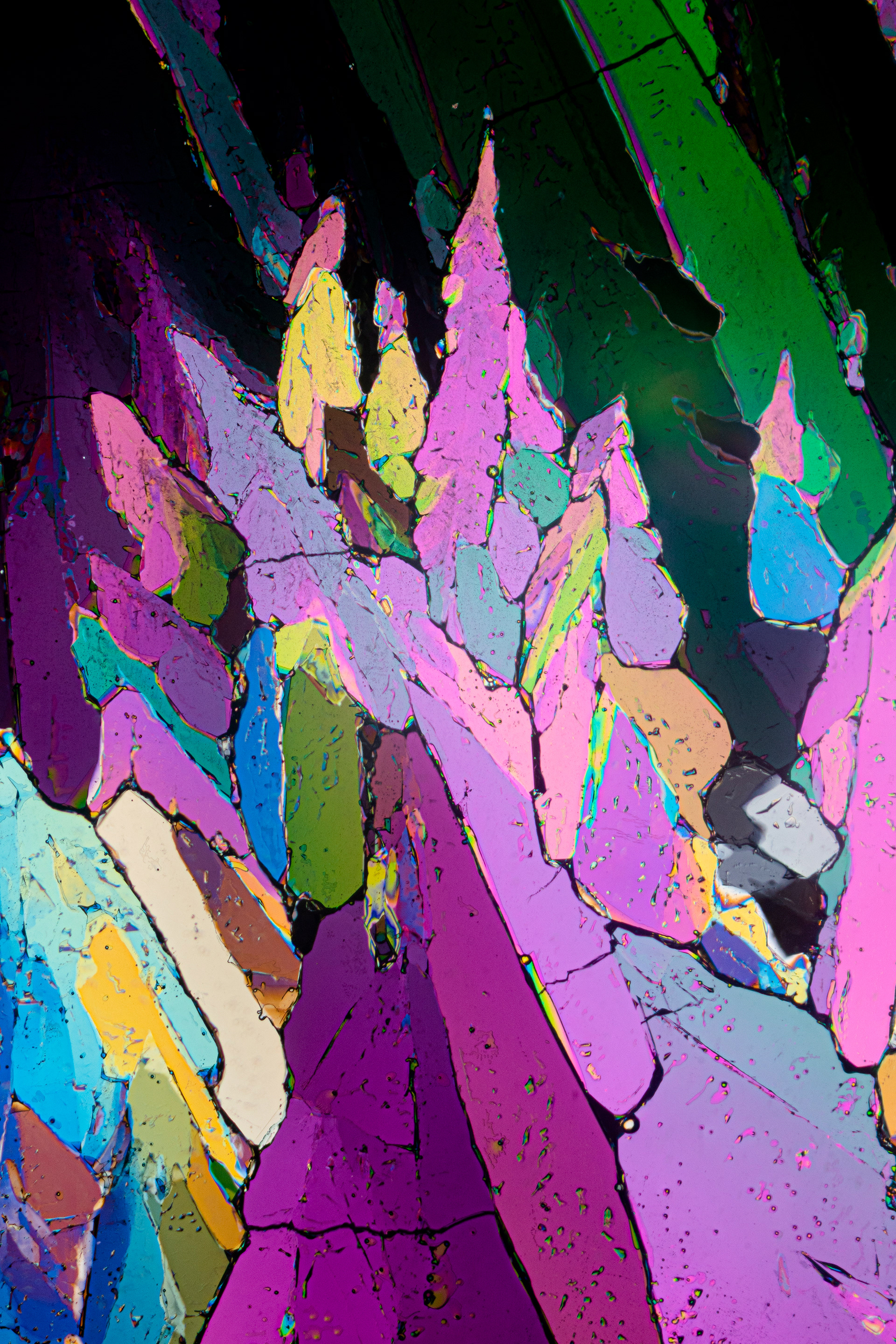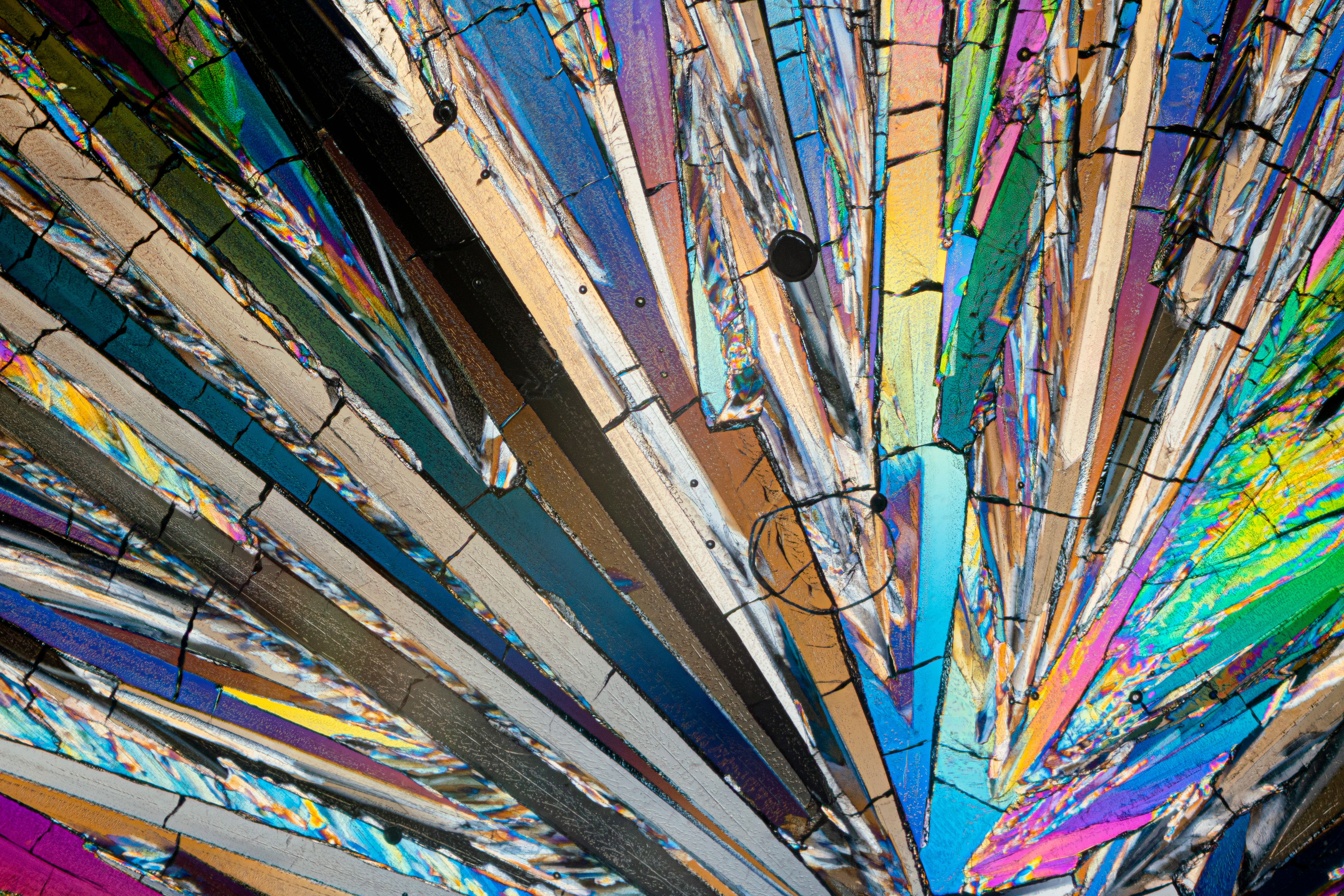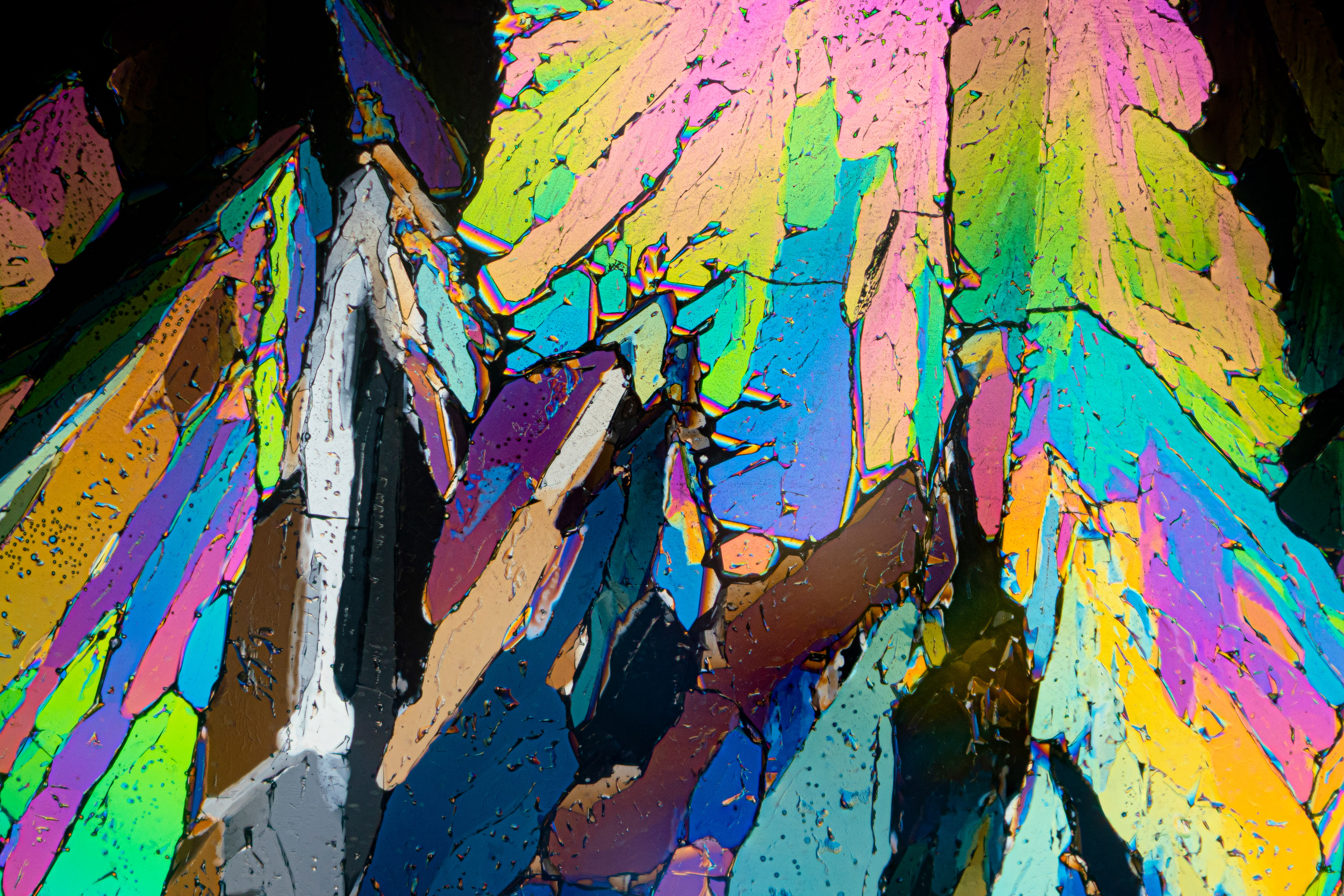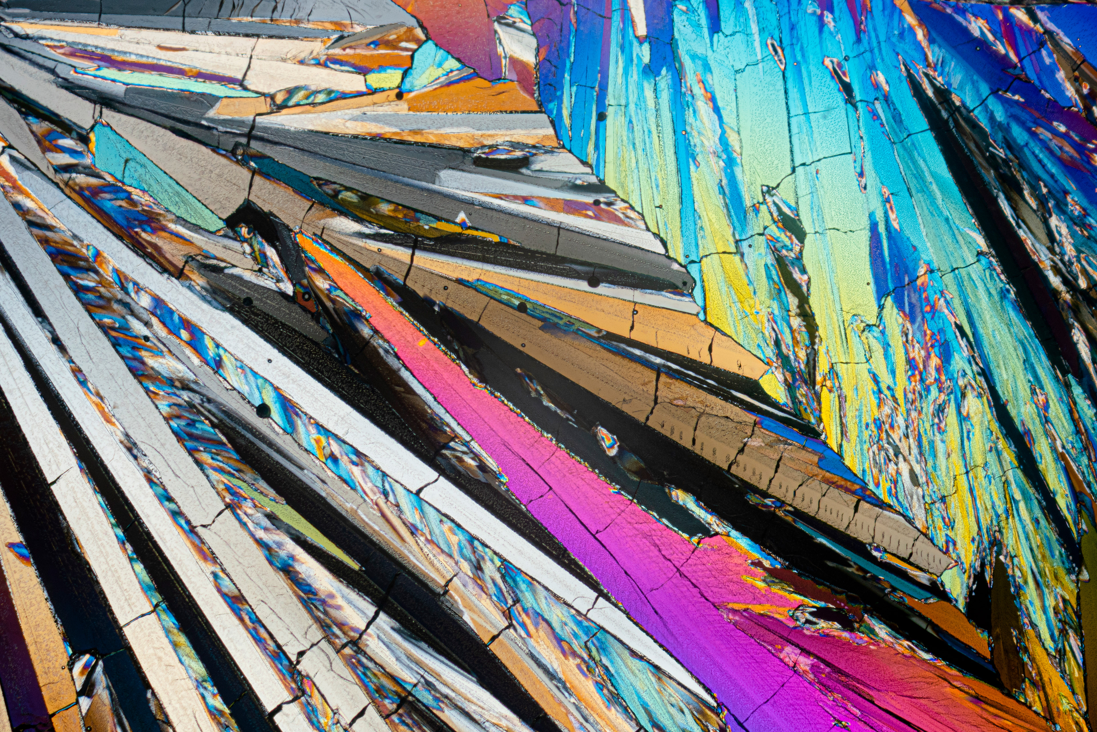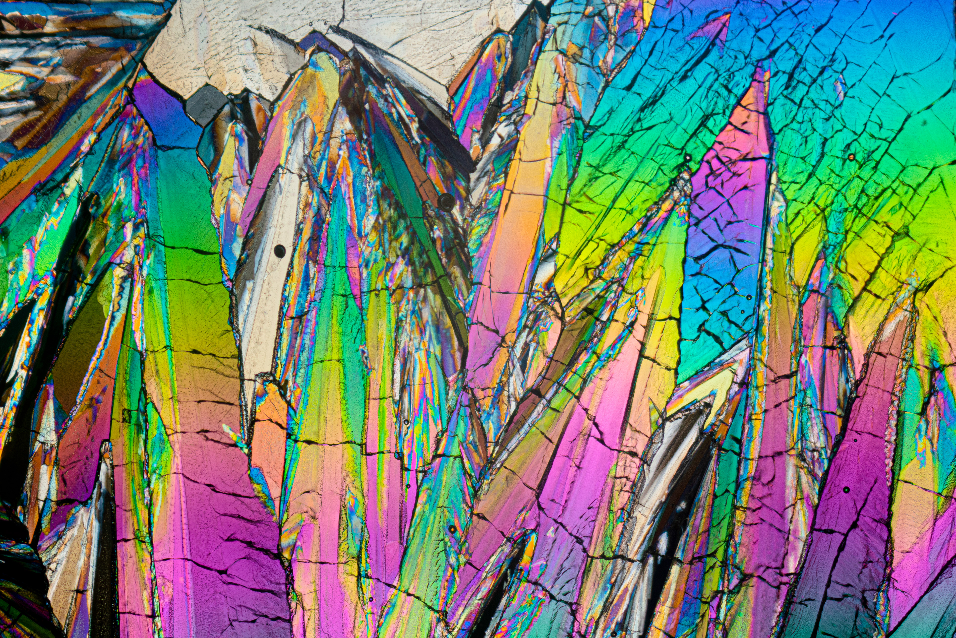 Crystalized erythrit, a sugar replacement, as seen under the microscope in polarized light